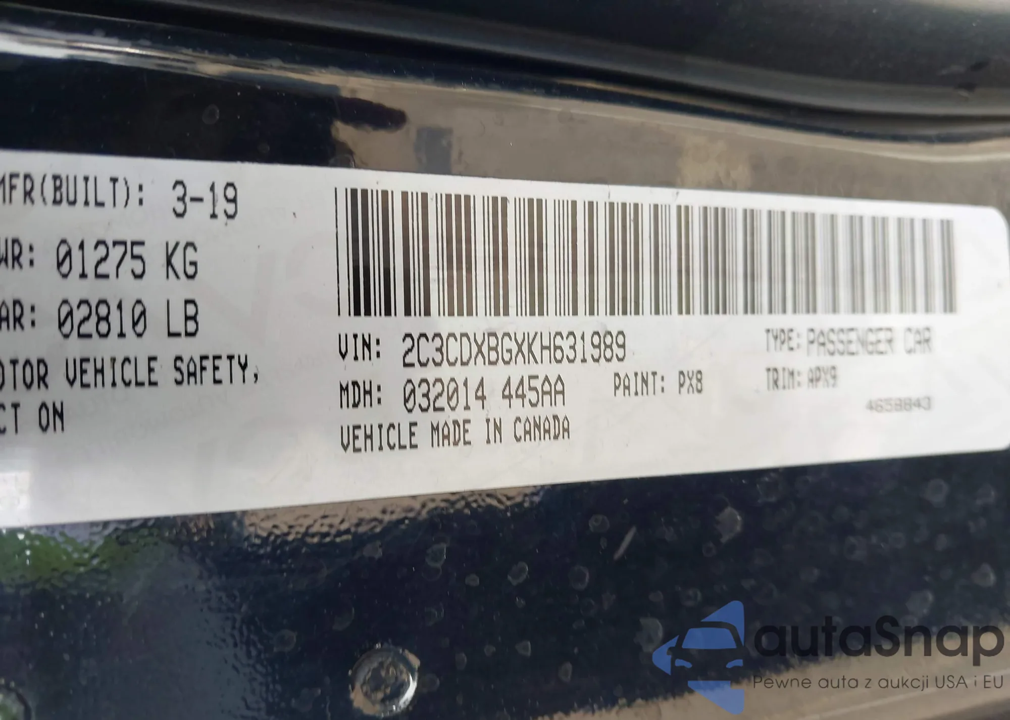 LOT: 43772970 VIN: 2C3CDXBGXKH631989