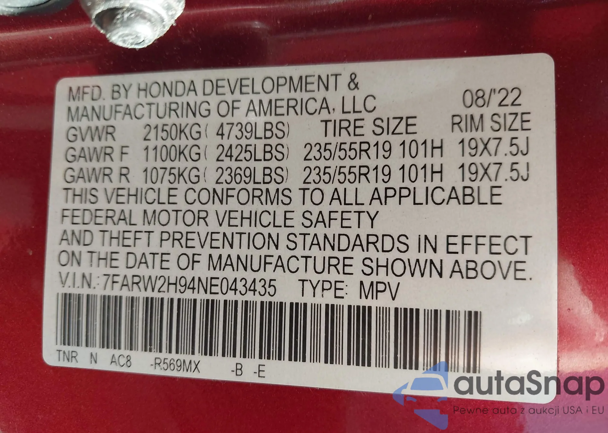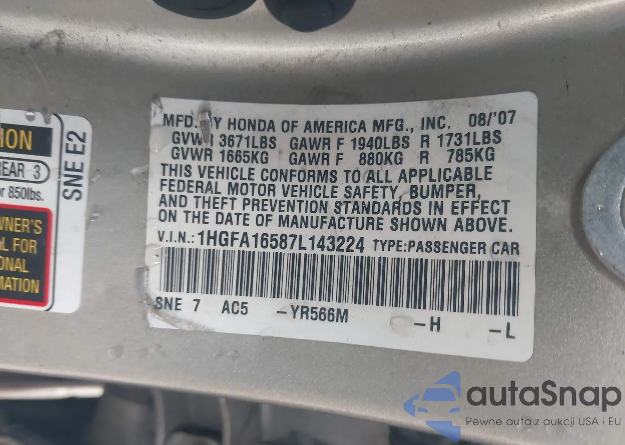 LOT: 43690397 VIN: 1HGFA16587L143224