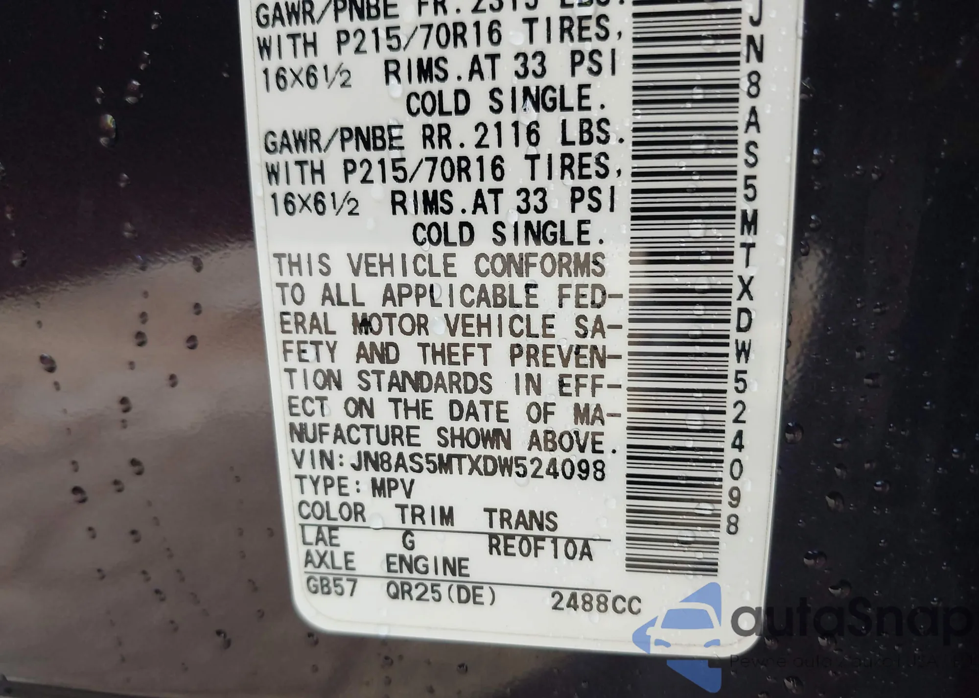 • VIN JN8AS5MTXDW524098