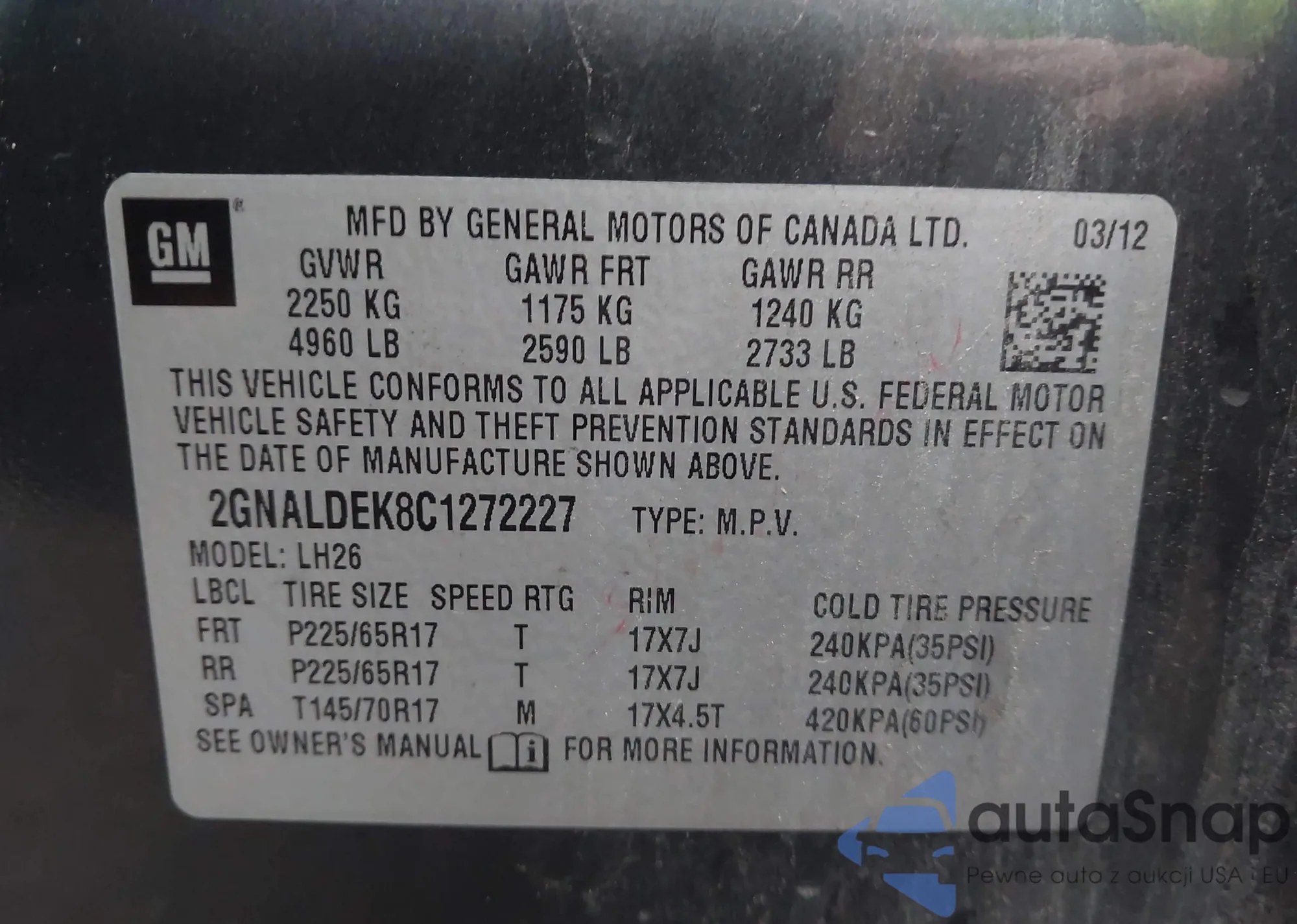LOT: 43703492 VIN: 2GNALDEK8C1272227
