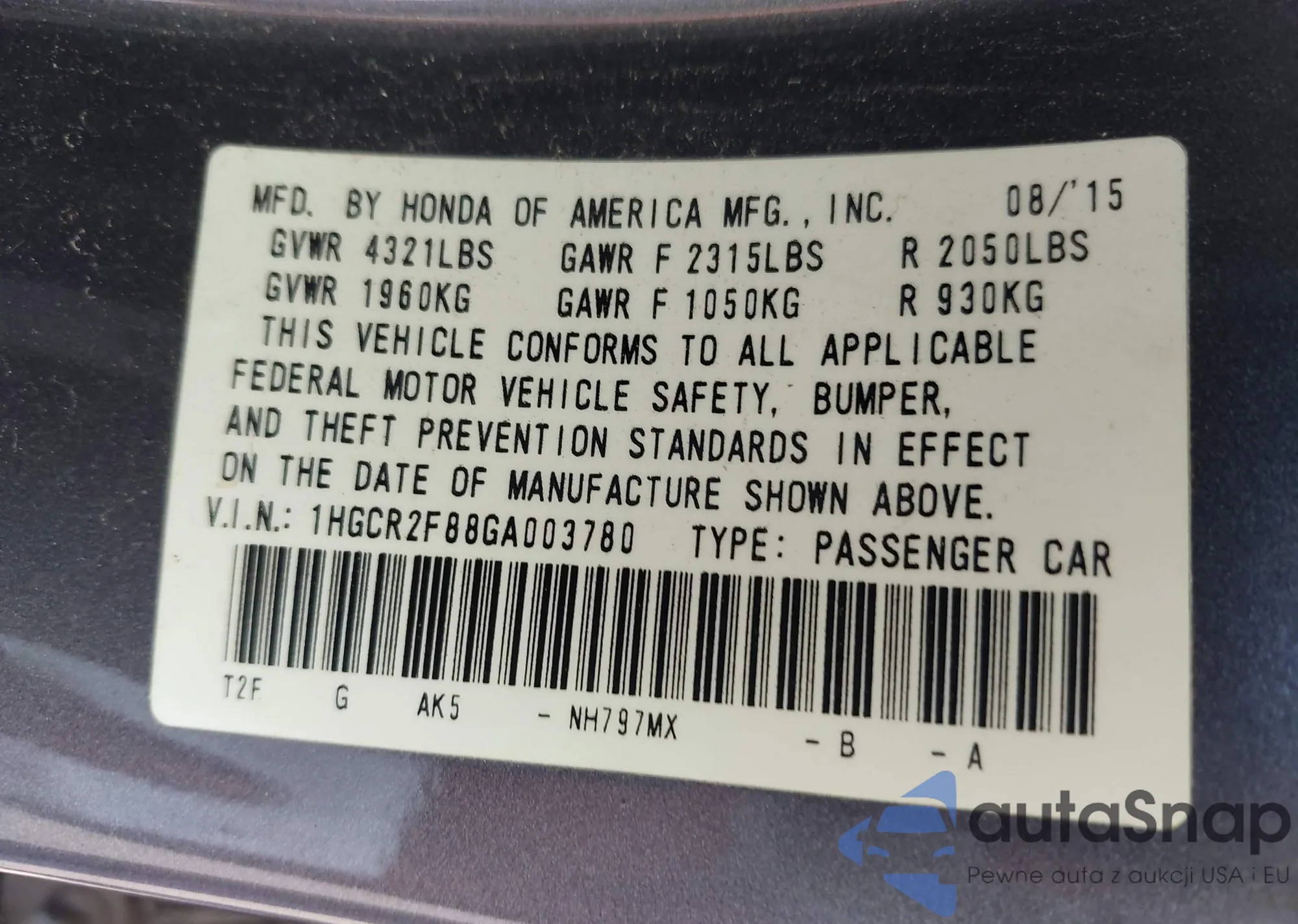• VIN 1HGCR2F88GA003780