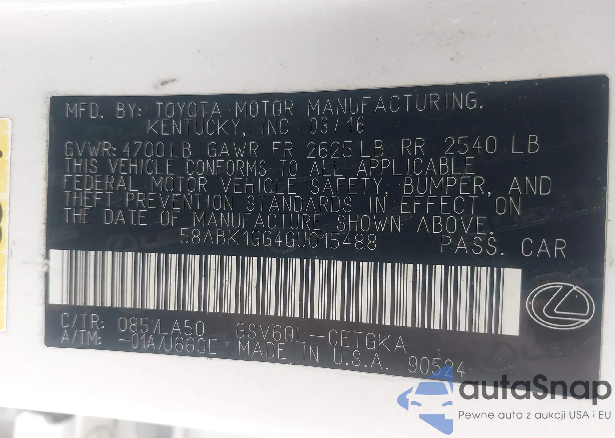 2016 Lexus Es 350 z USA, uszkodzony, nr VIN 58ABK1GG4GU015488