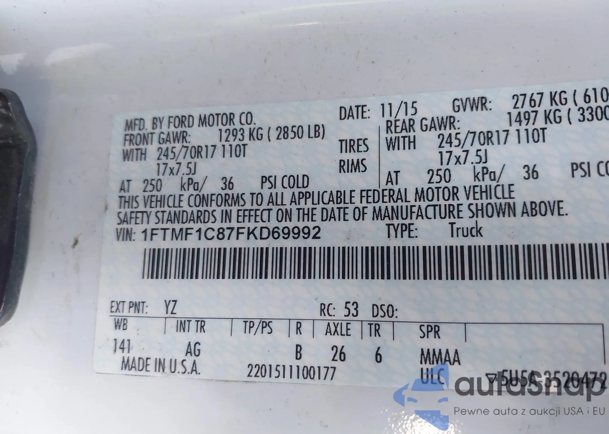 LOT: 31507002 VIN: 1FTRW07LX1KE33109