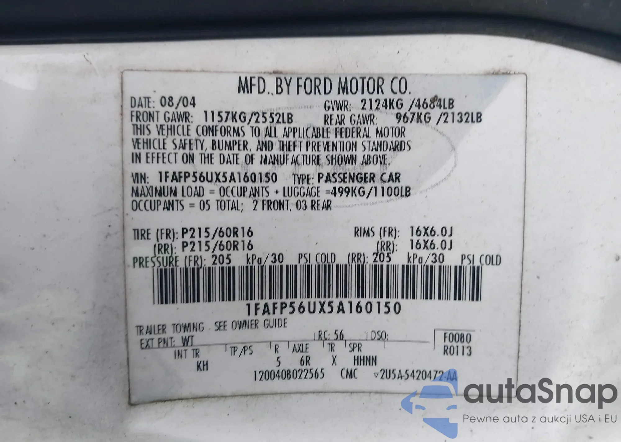 • VIN 1FAFP56UX5A160150