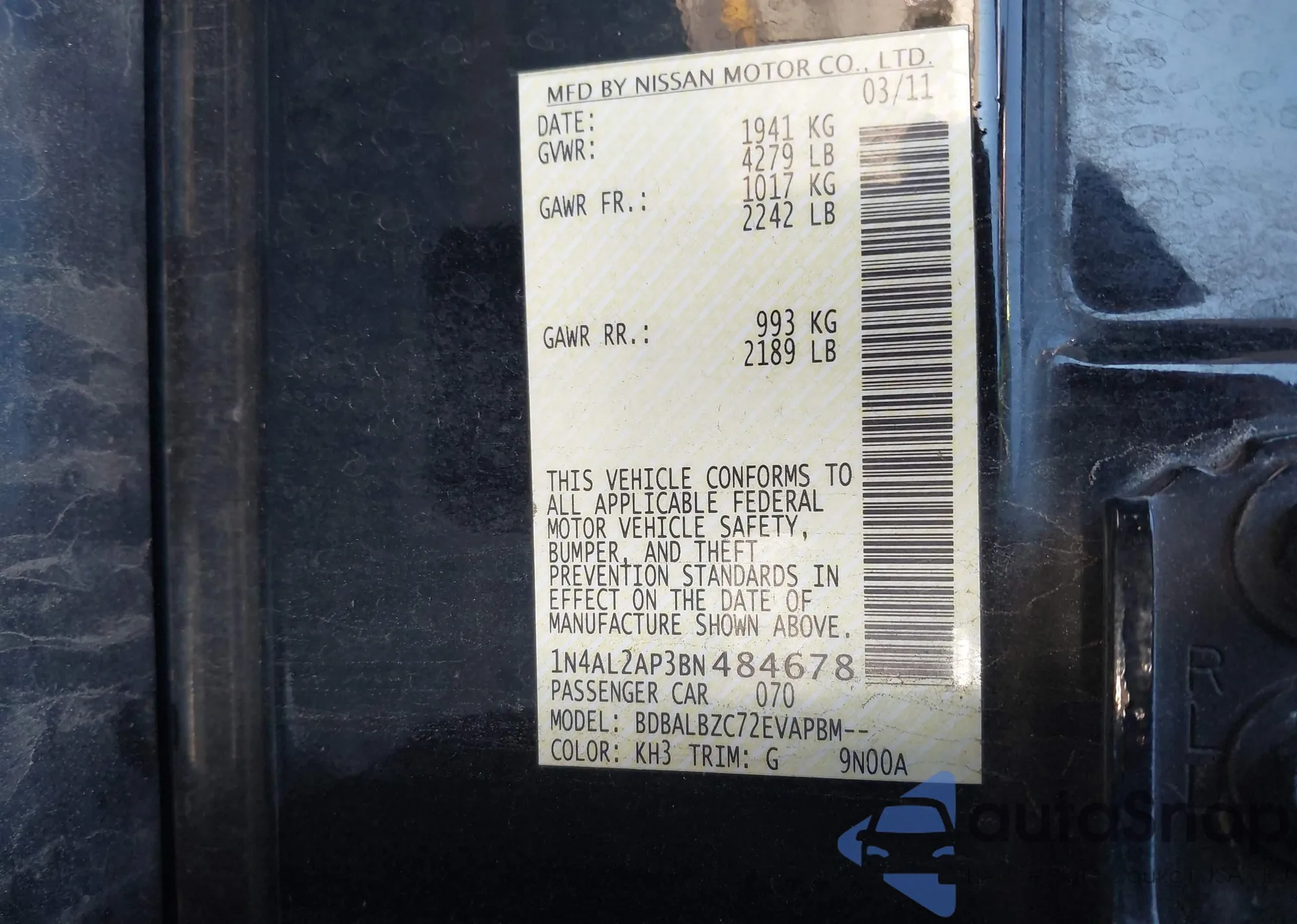 • VIN 1N4AL2AP3BN484678