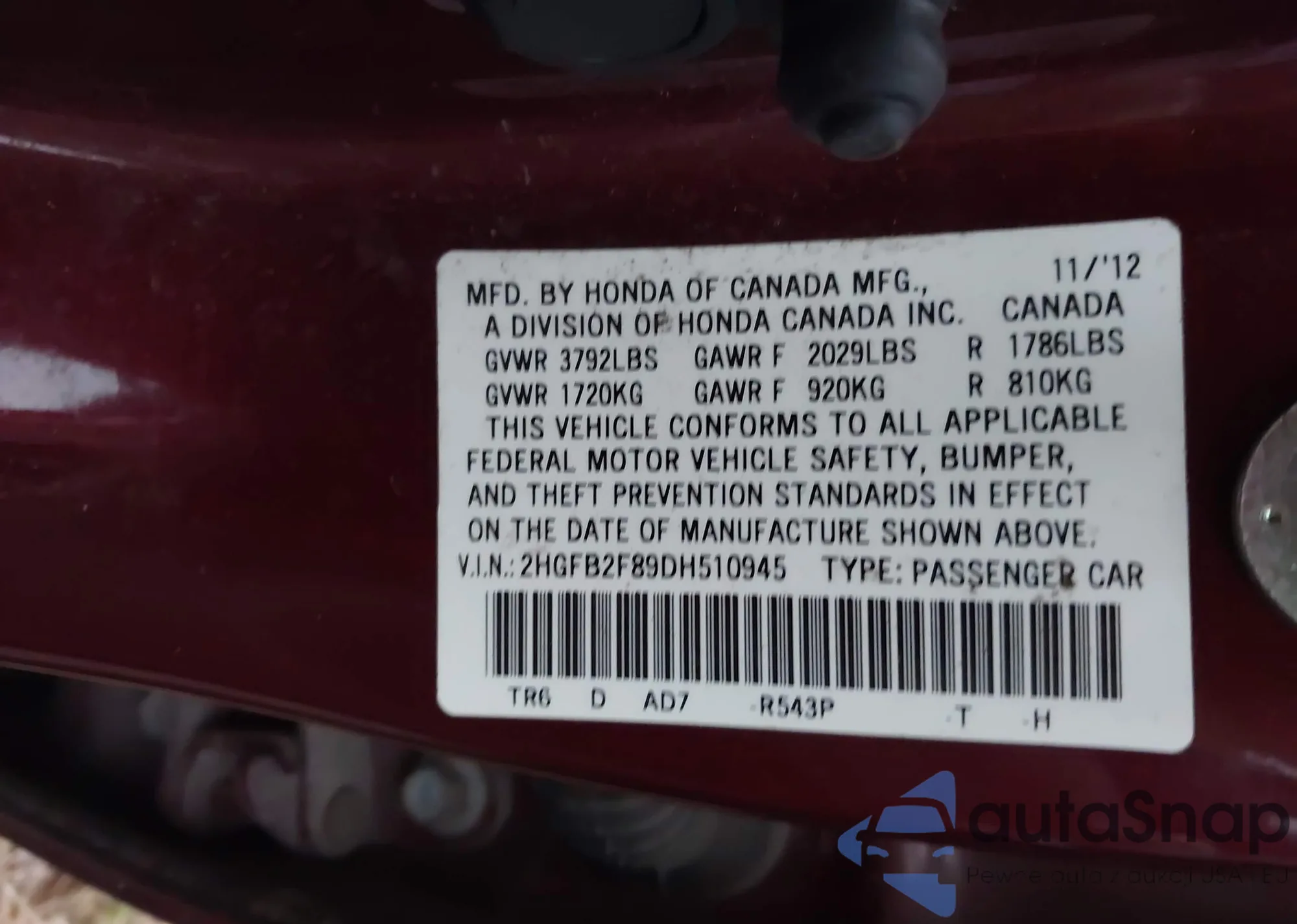 • VIN 2HGFG1B6XAH524929