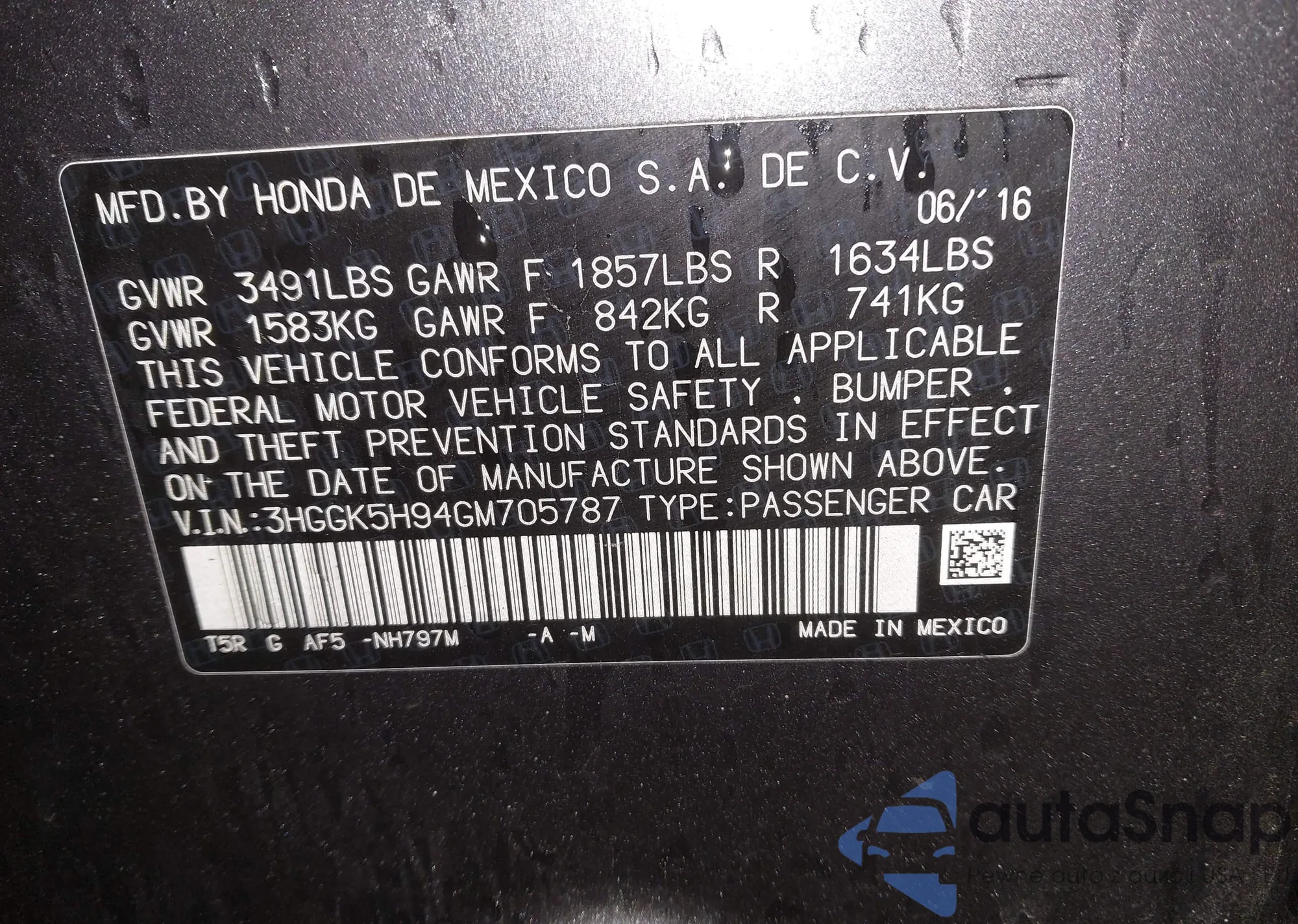 • VIN 3HGGK5H94GM705787