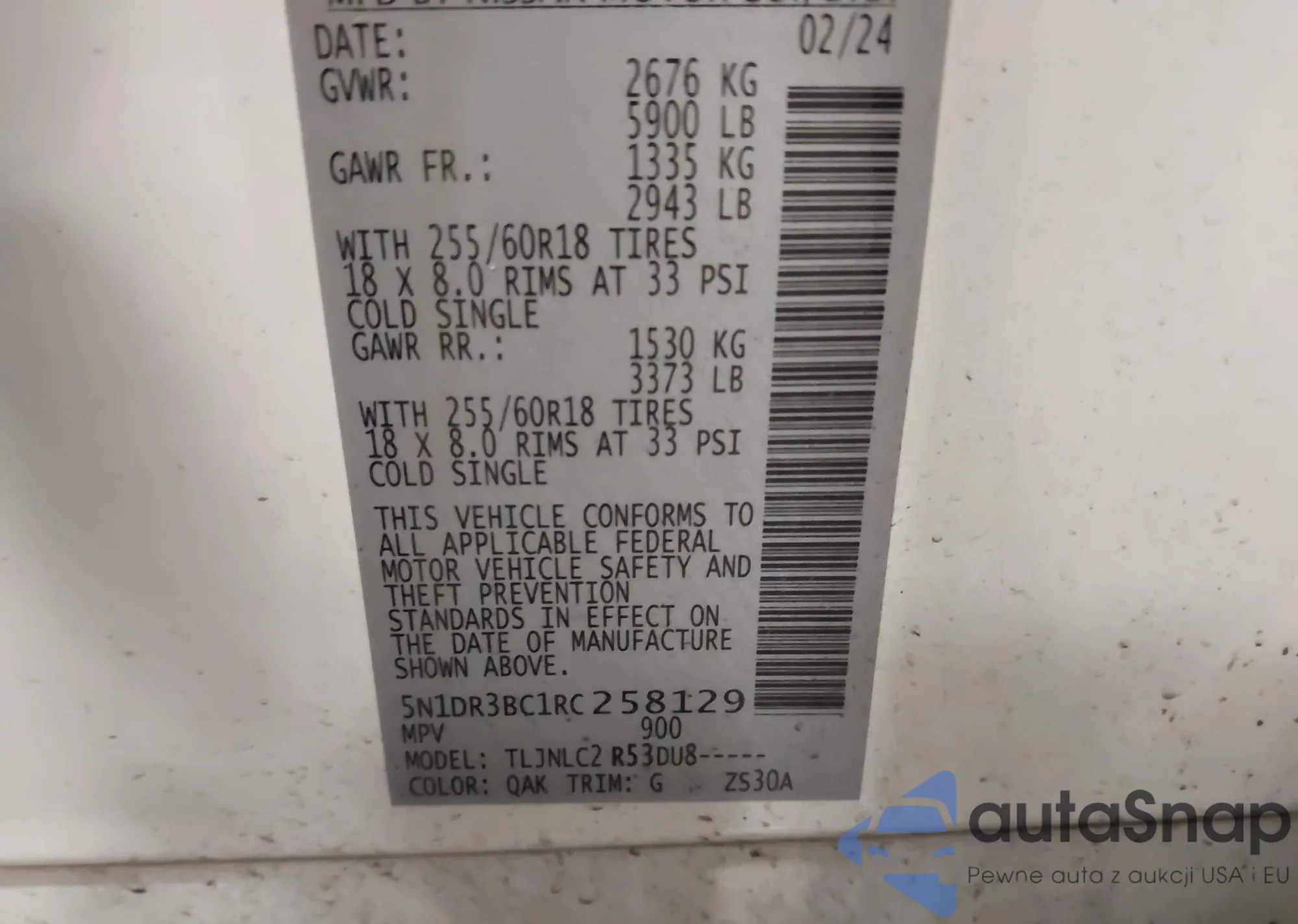 • VIN 5N1DR3BC1RC258129