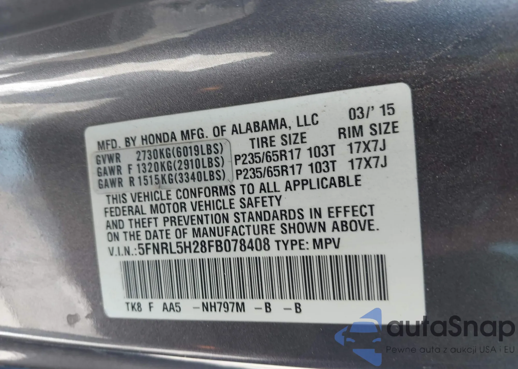 LOT: 43405203 VIN: 5FNRL5H28FB078408