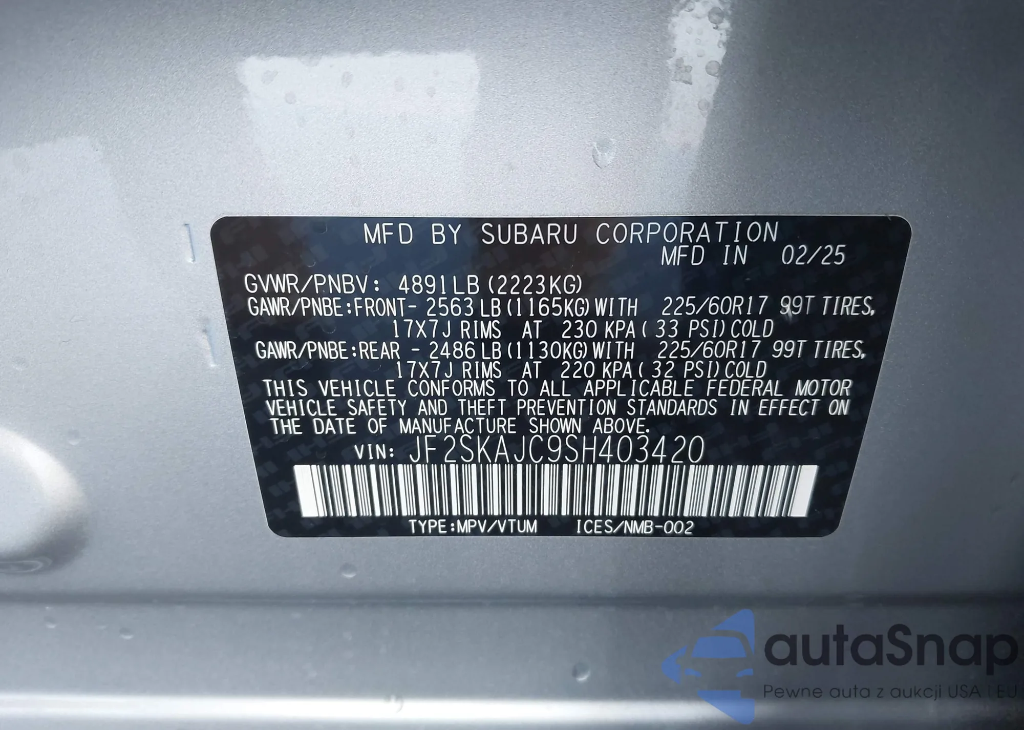 LOT: 43485476 VIN: JF2SKAJC9SH403420