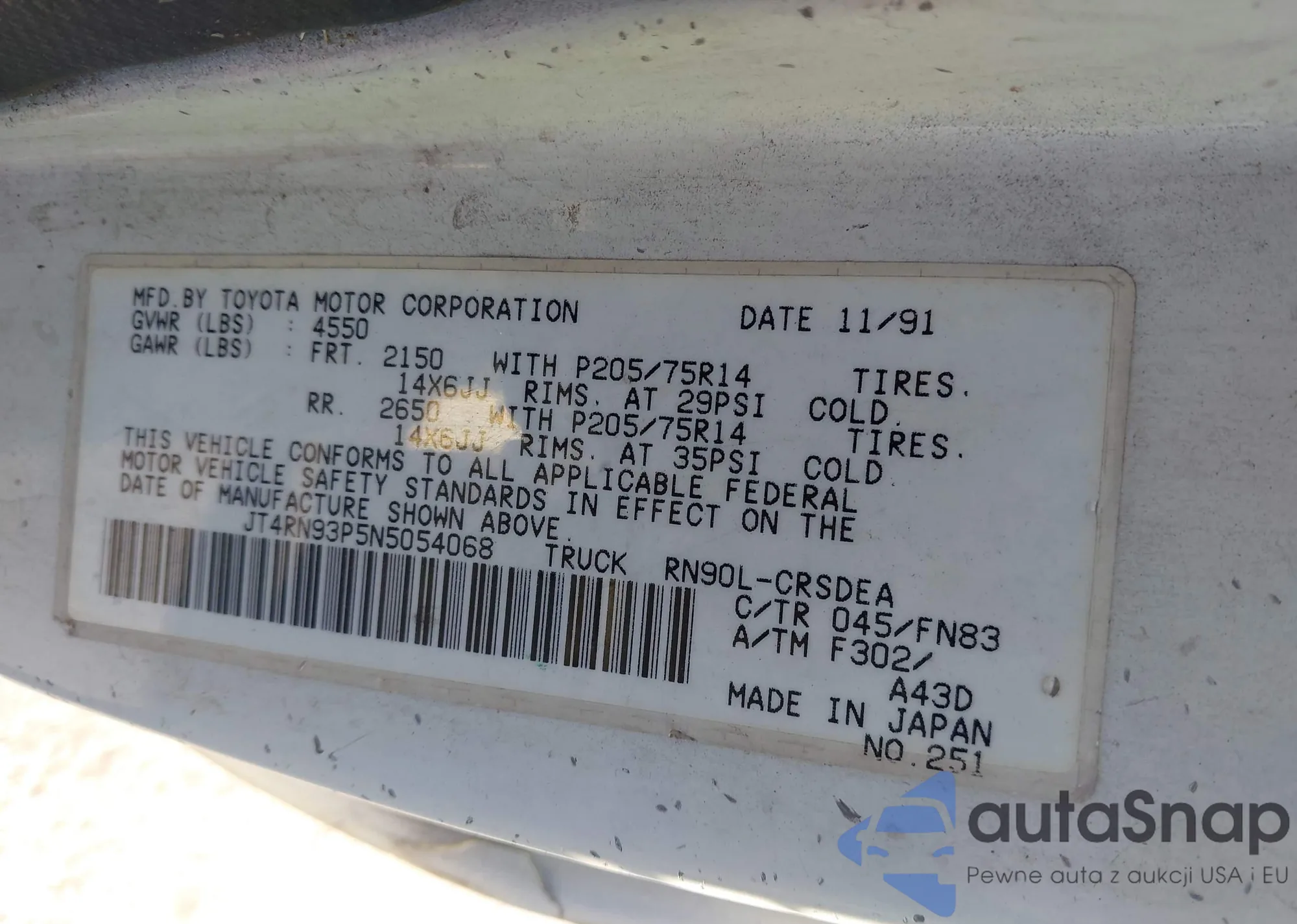 LOT: 43857036 VIN: JT4RN93P5N5054068