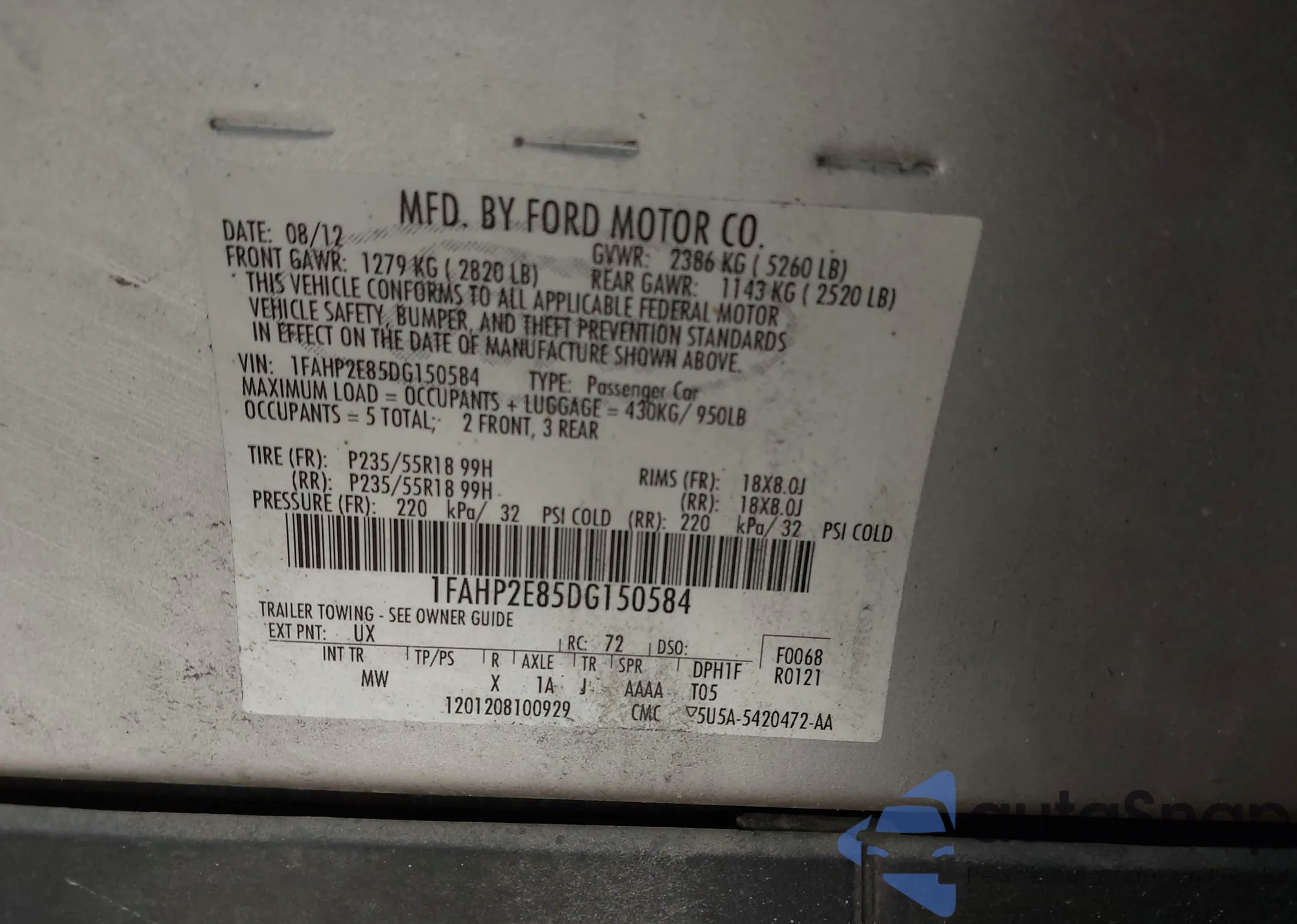 LOT: 43796881 VIN: 3FA6P0G7XDR249538
