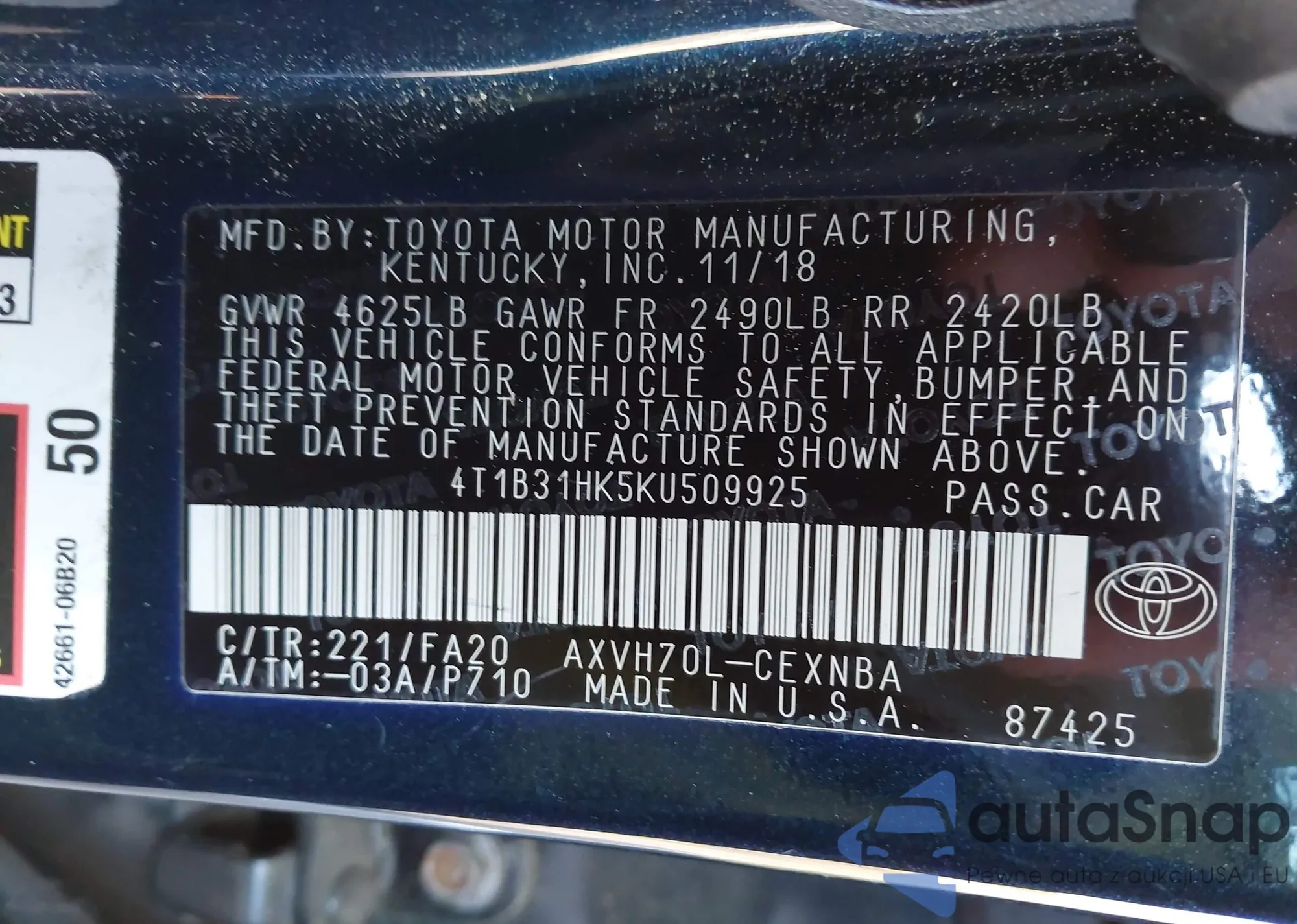• VIN 4T1B31HK5KU509925