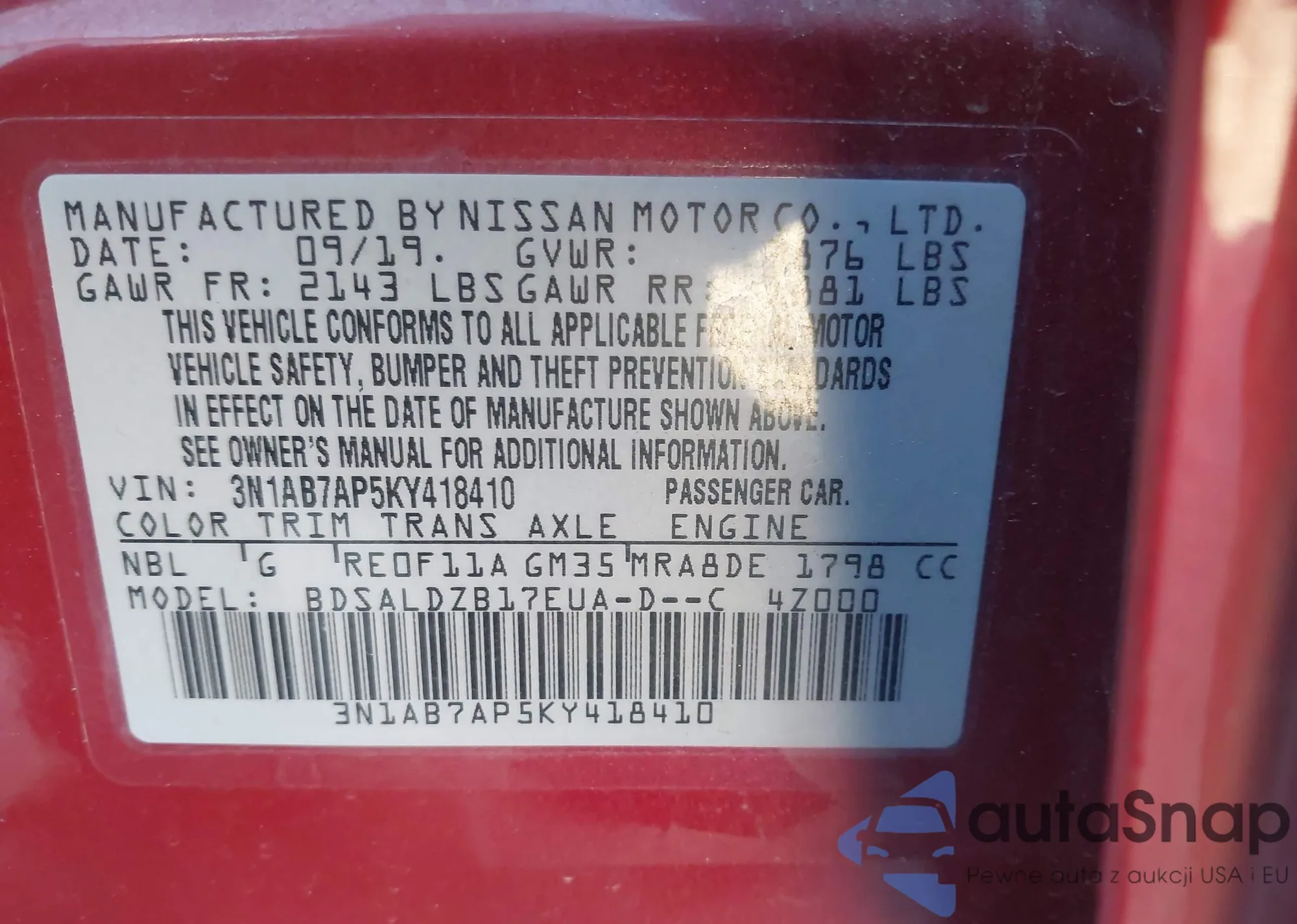 LOT: 43911203 VIN: 3N1AB7AP5KY418410