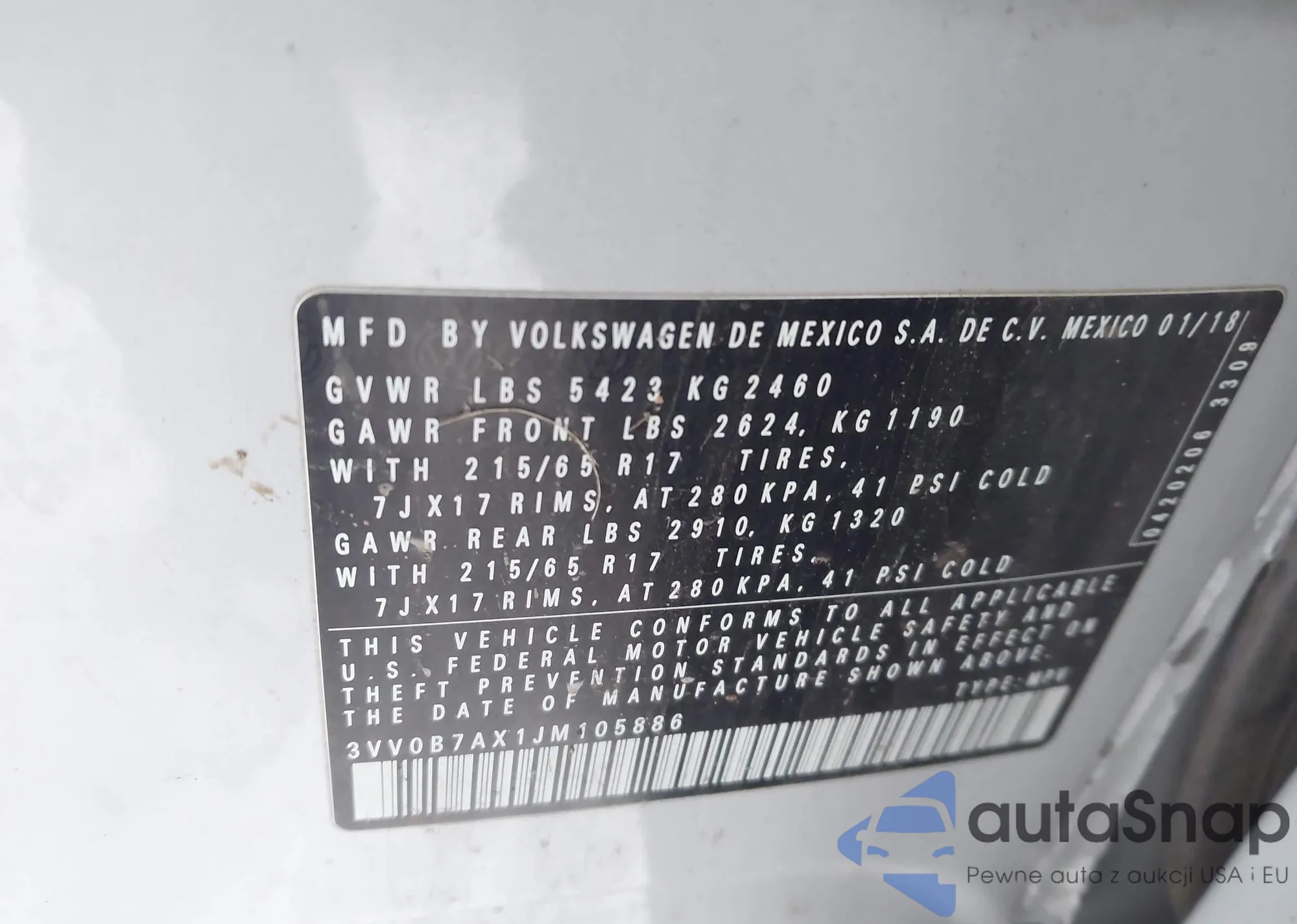 LOT: 43769217 VIN: 3VWDB7AJ0JM214851