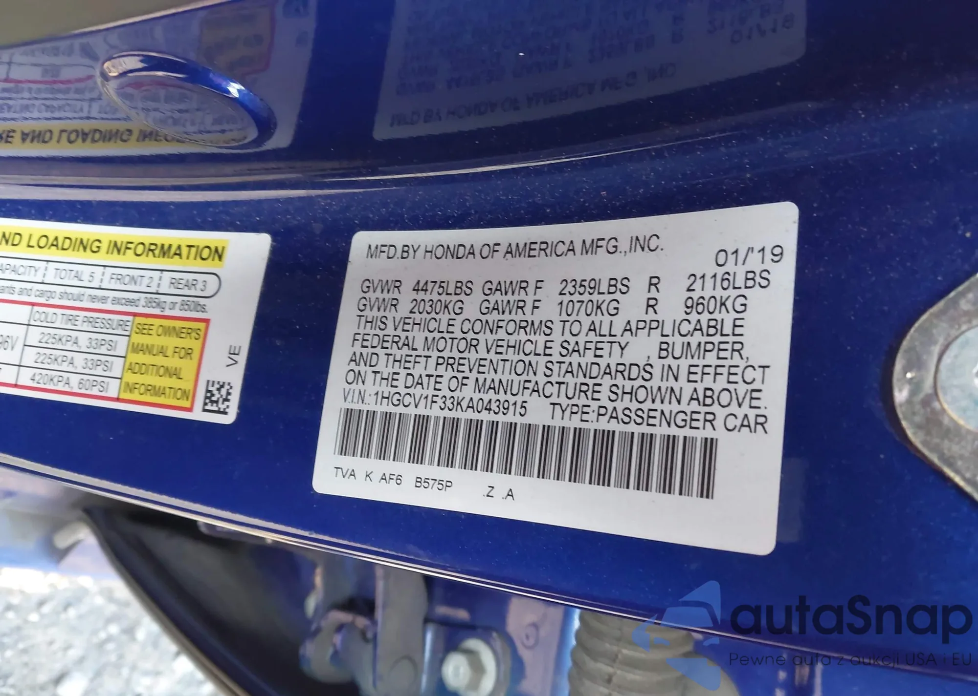 LOT: 43924731 VIN: 1HGCV1F33KA043915