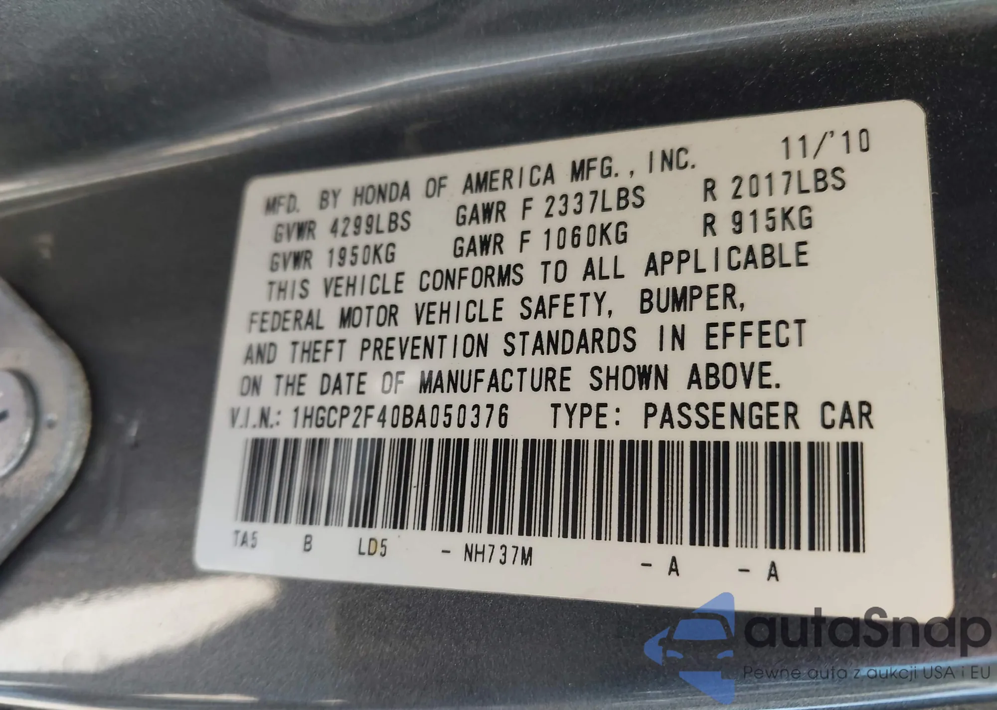 LOT: 43565104 VIN: 1HGCP2F40BA050376