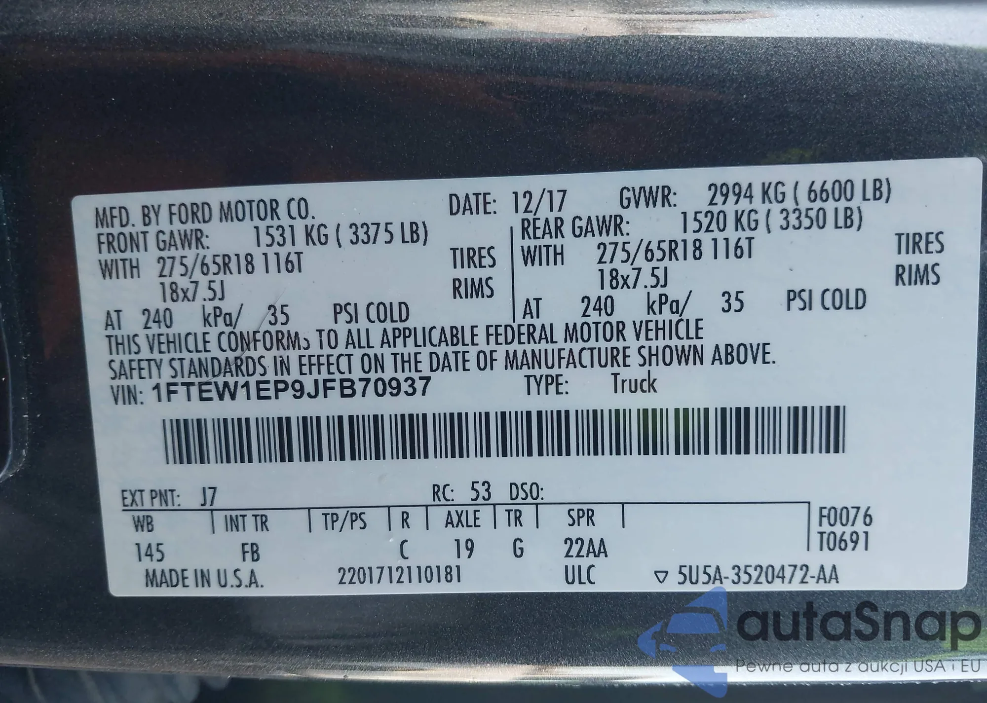 LOT: 43704276 VIN: 1FTEW1EP9JFB70937
