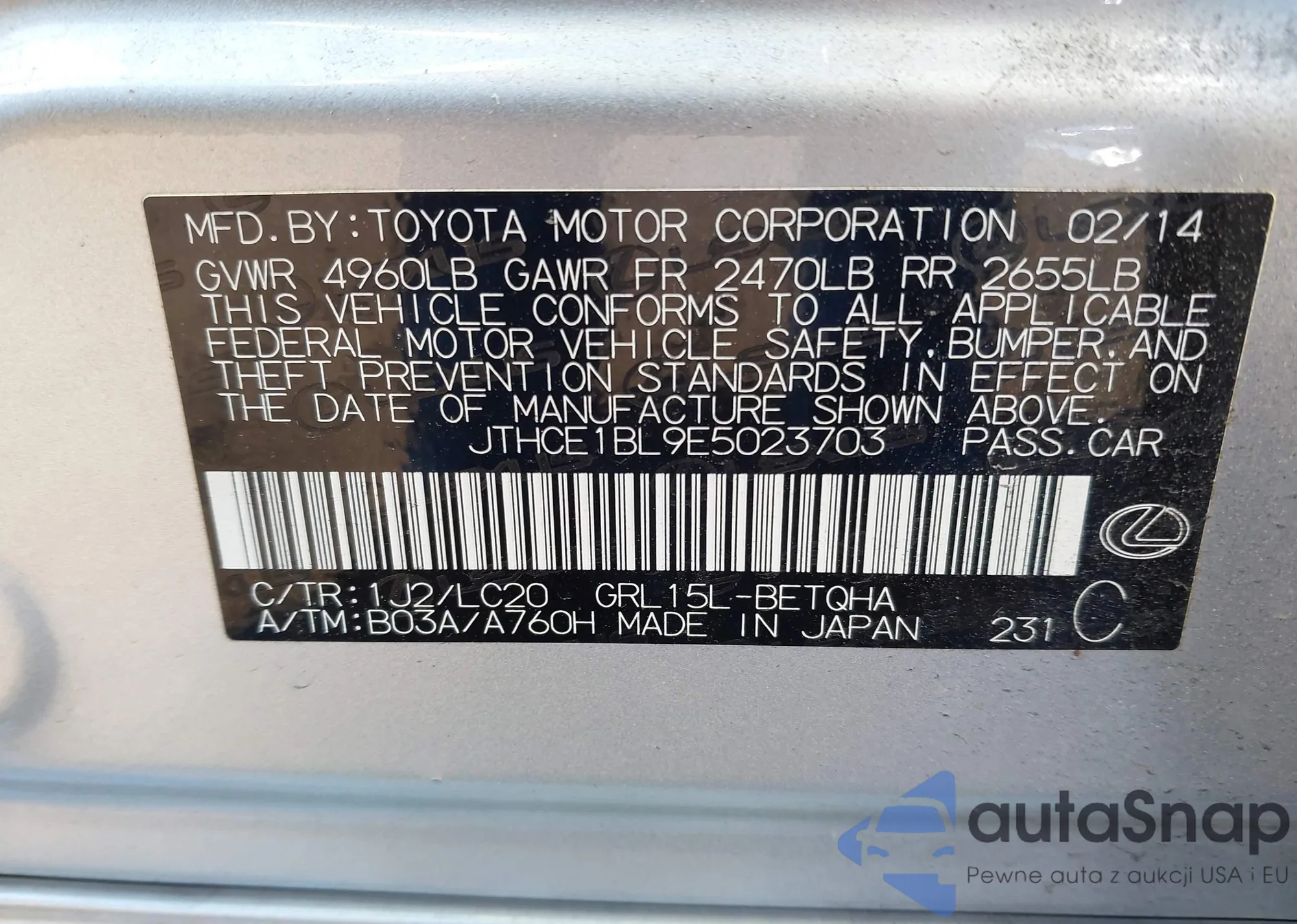 • VIN JTHCE1BL9E5023703
