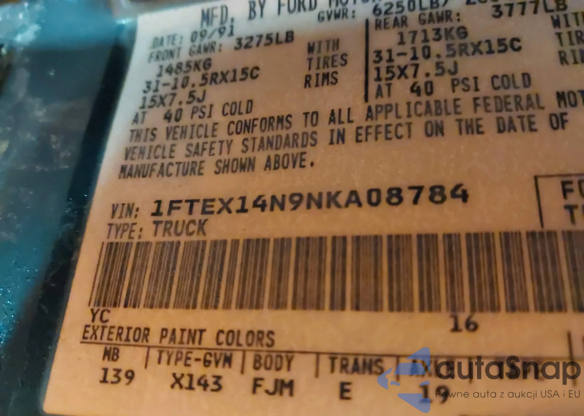 1992 Ford F150 z USA, uszkodzony, nr VIN 1FTEX14N9NKA08784