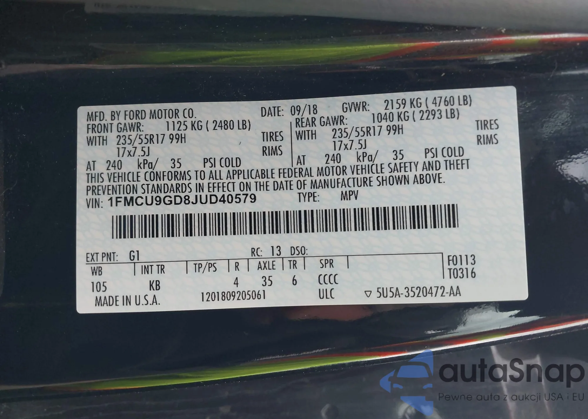 • VIN 1FMCU9GD8JUD40579