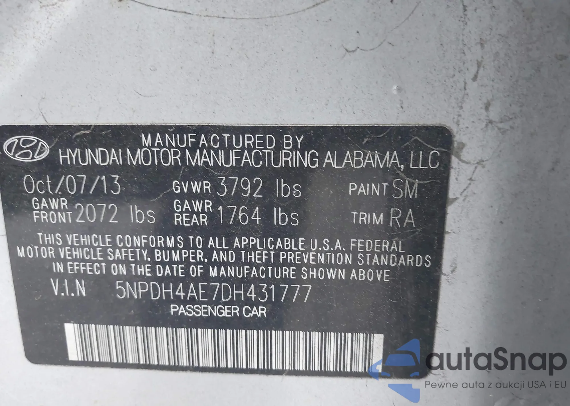 • VIN 5NPDH4AE7DH431777