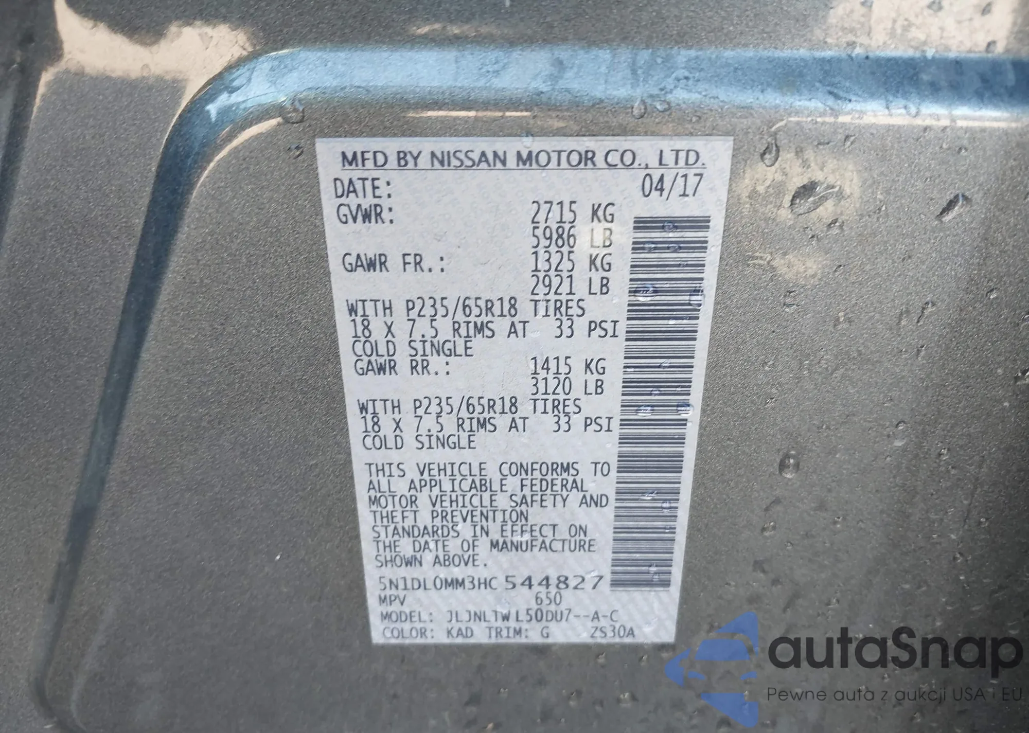 LOT: 43343878 VIN: 5N1DL0MM3HC544827