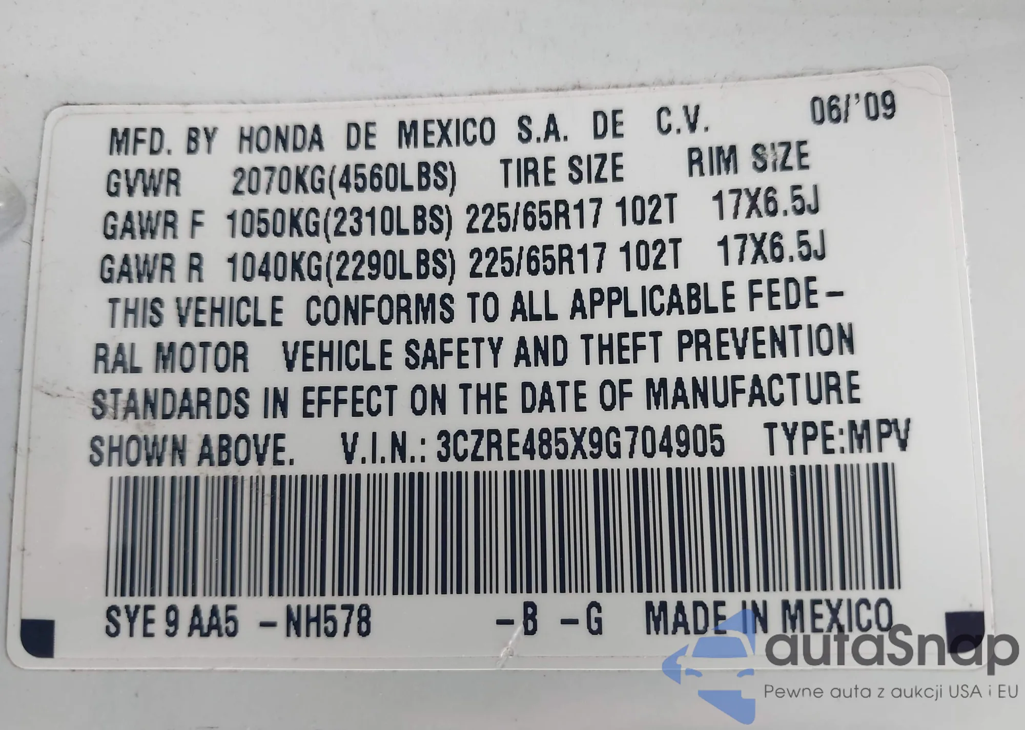 • VIN 3CZRE485X9G704905