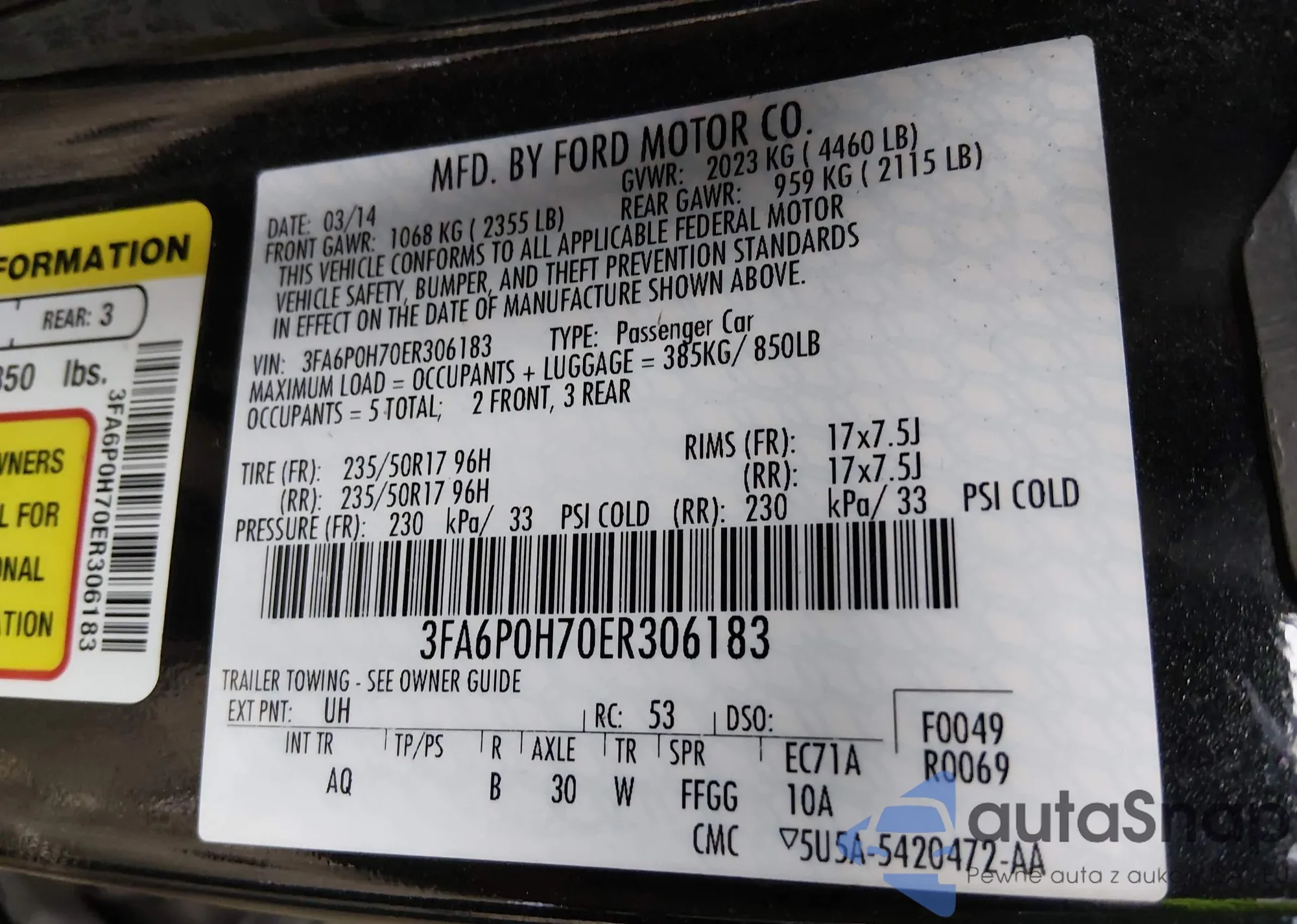 LOT: 43780207 VIN: 3FA6P0H70ER306183