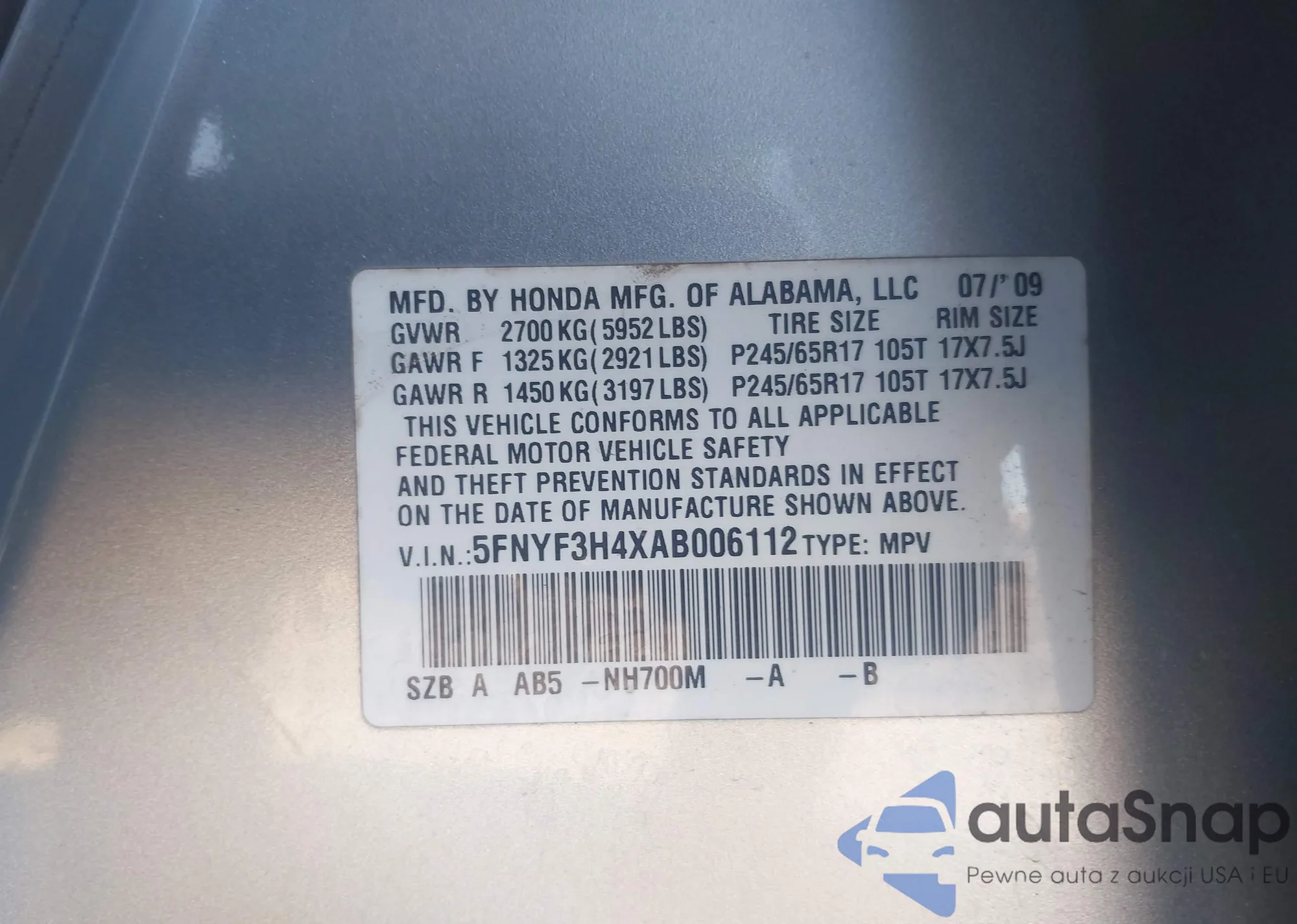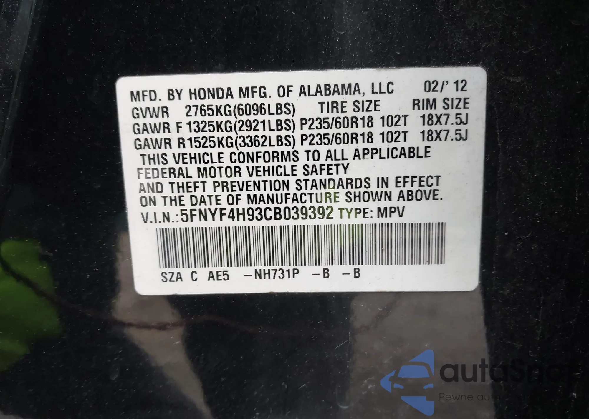 • VIN 5FNYF4H93CB039392