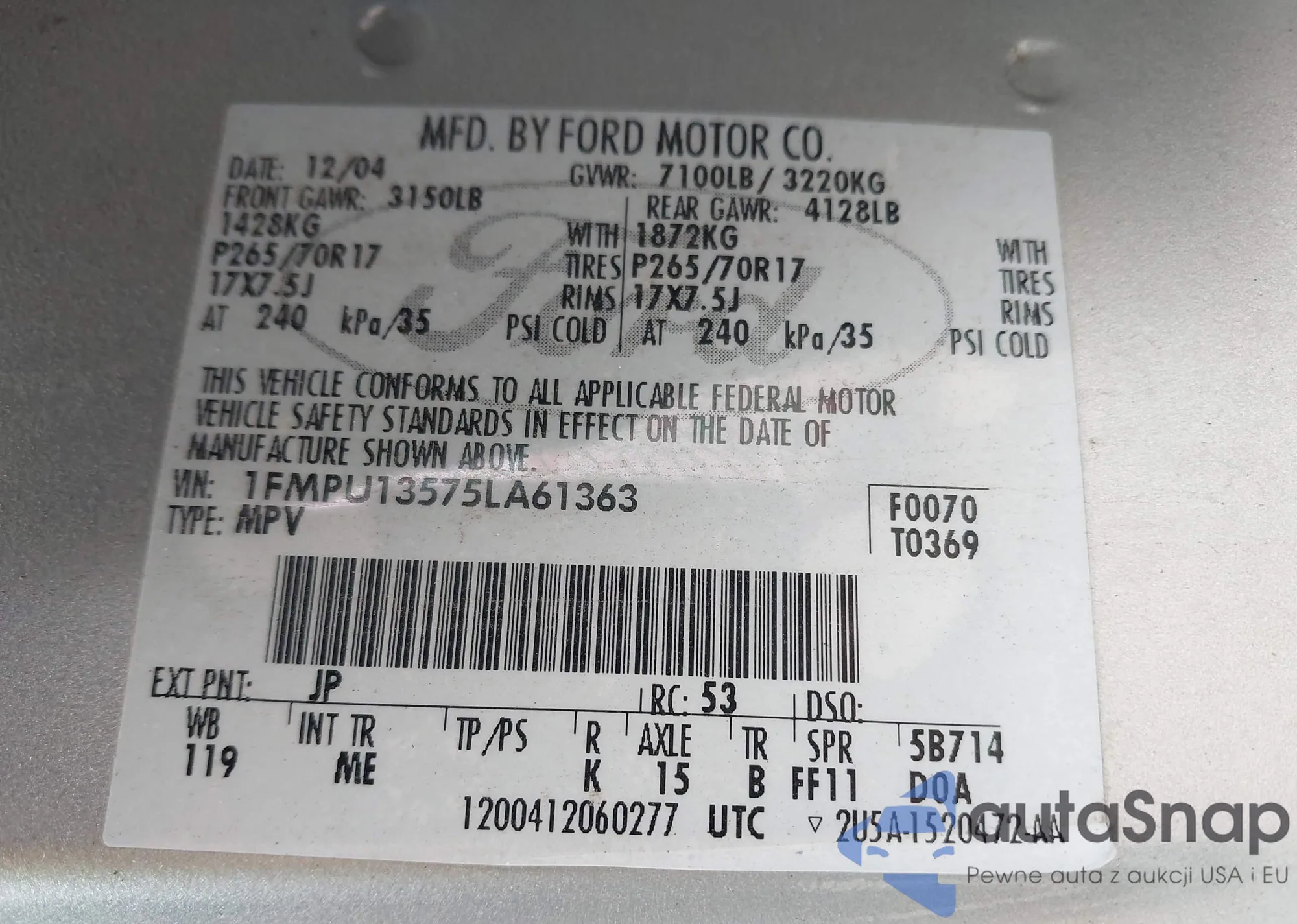 LOT: 43831038 VIN: 1FMPU13575LA61363
