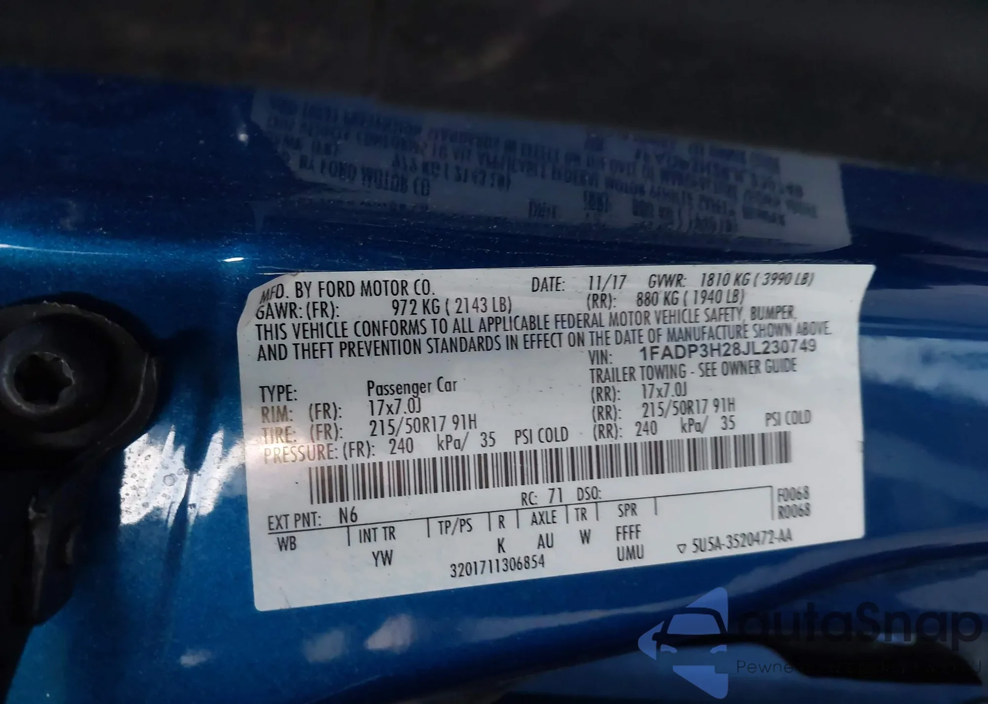 LOT: 43910103 VIN: 1FADP3H28JL230749