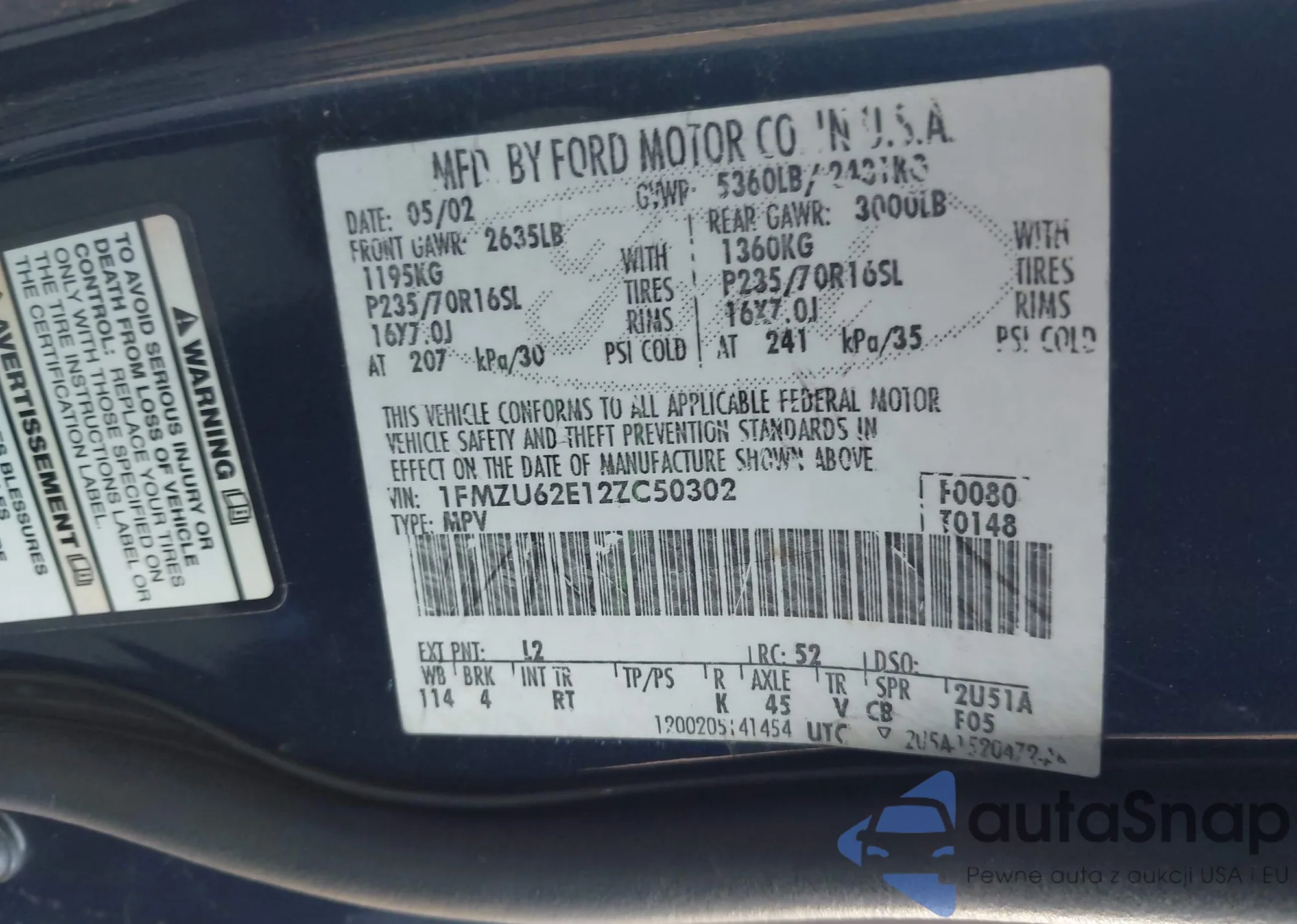 LOT: 43925304 VIN: 1FMZU62E12ZC50302