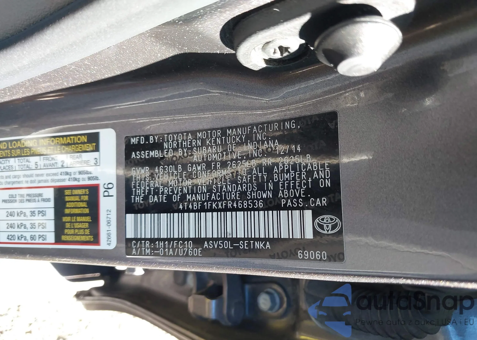 • VIN 4T4BF1FKXFR468536