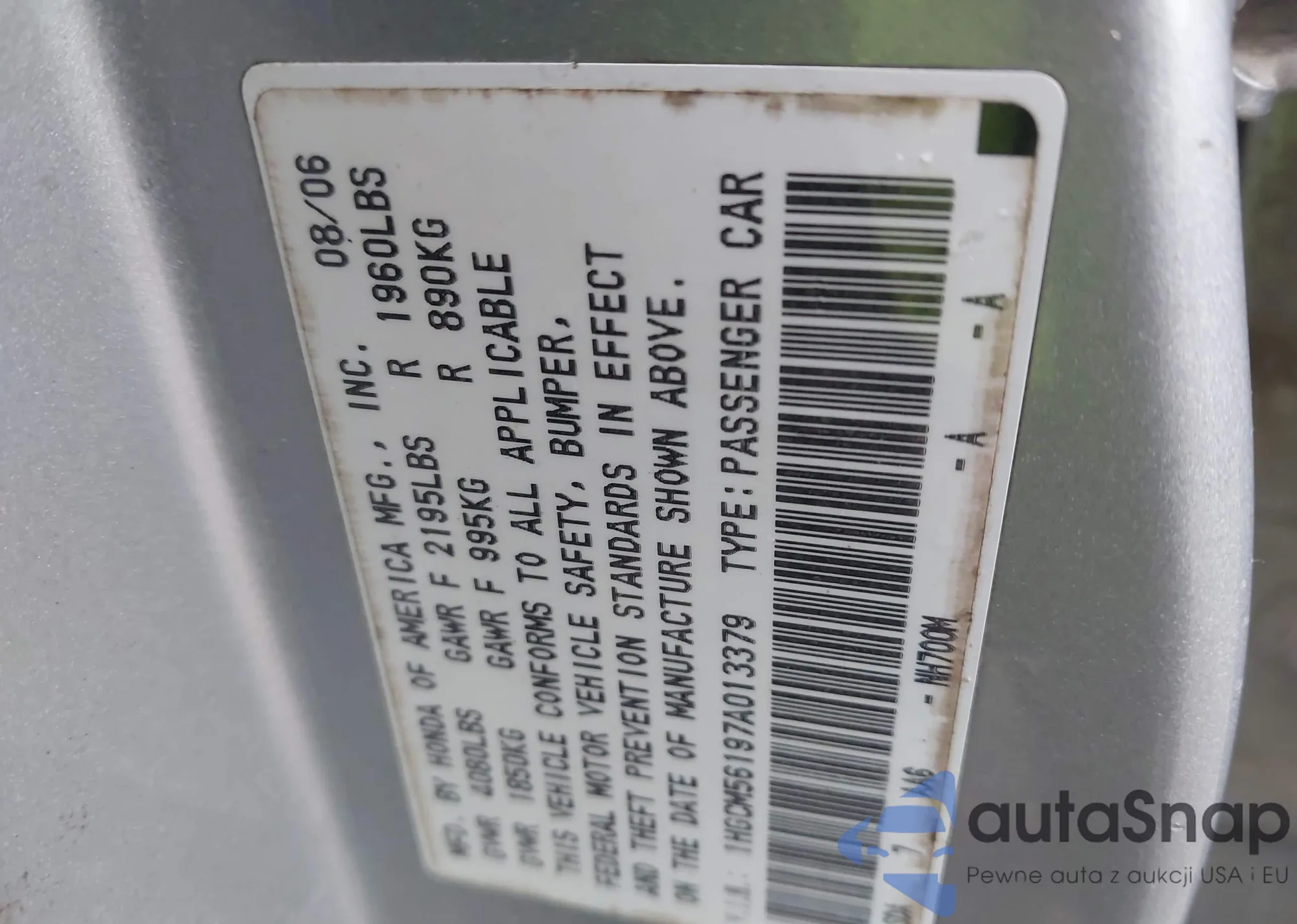 LOT: 43865243 VIN: 1HGCM56197A013379