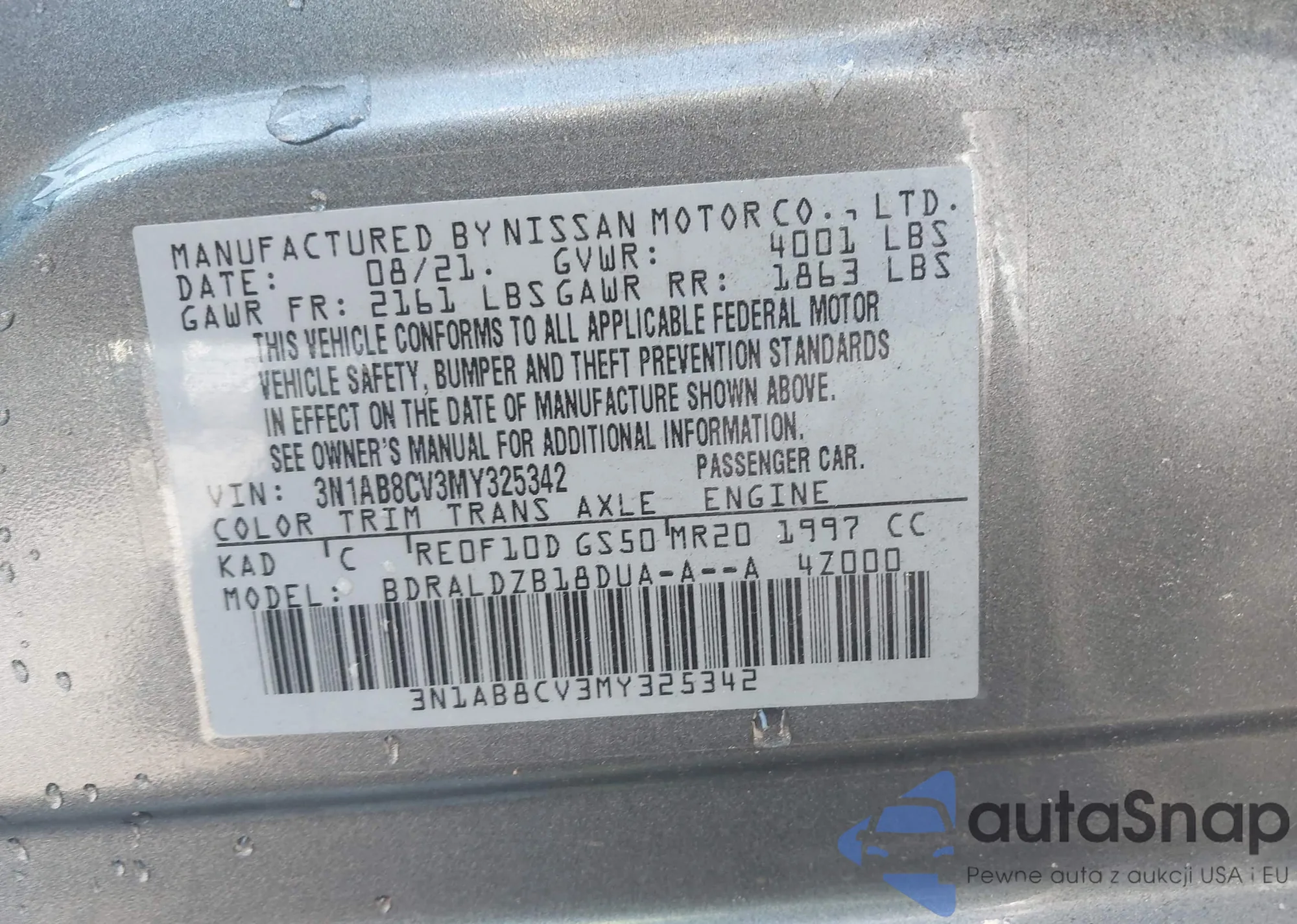 2021 Nissan Sentra Sv Xtronic Cvt z USA, uszkodzony, nr VIN 3N1AB8CV3MY325342