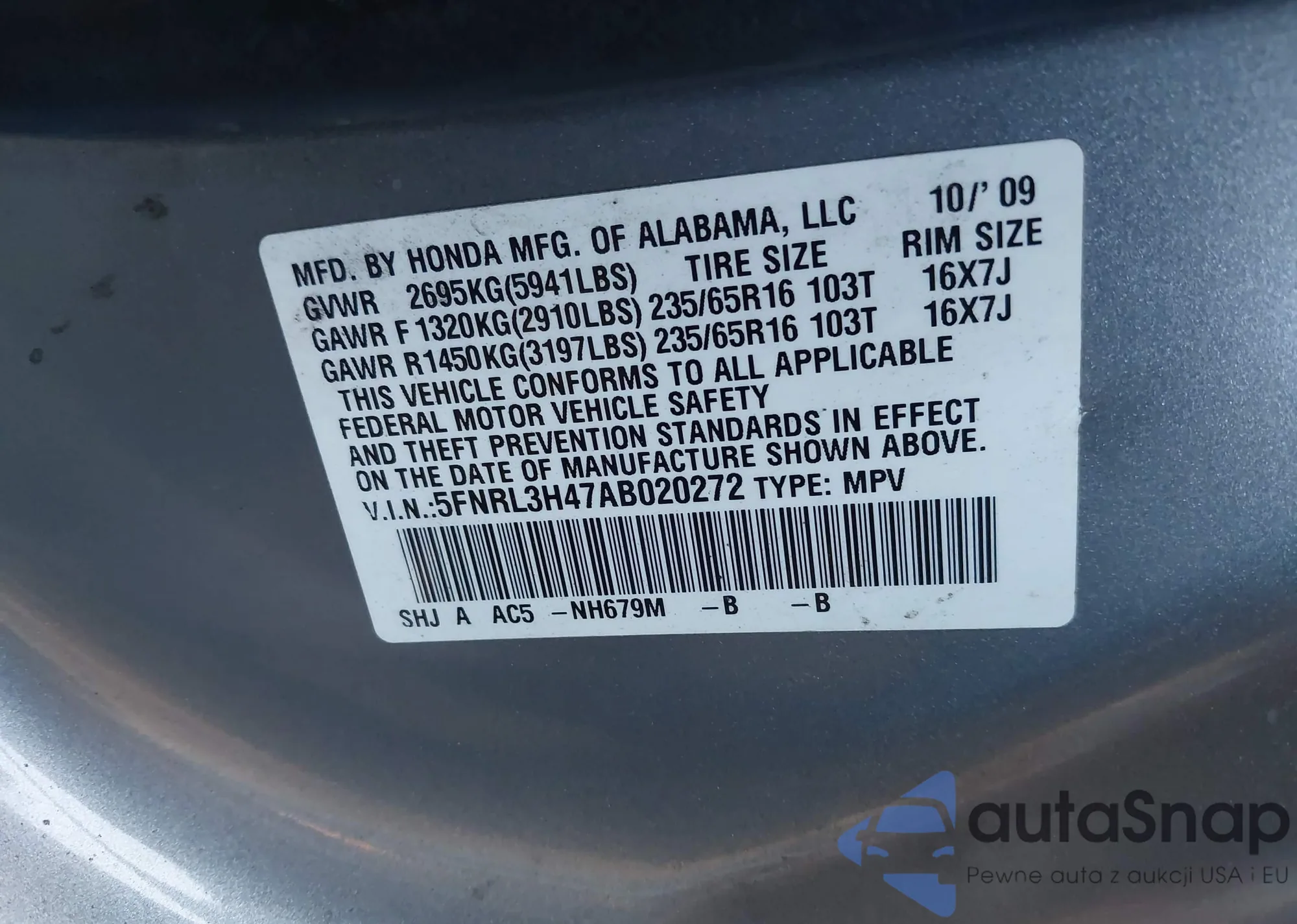 • VIN 5FNRL3H47AB020272
