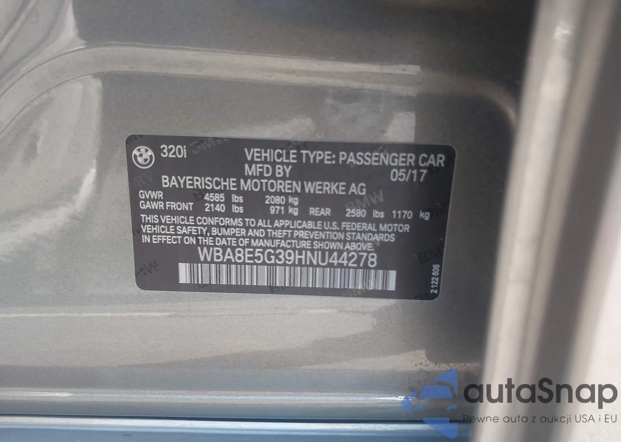 • VIN WBA8E5G39HNU44278