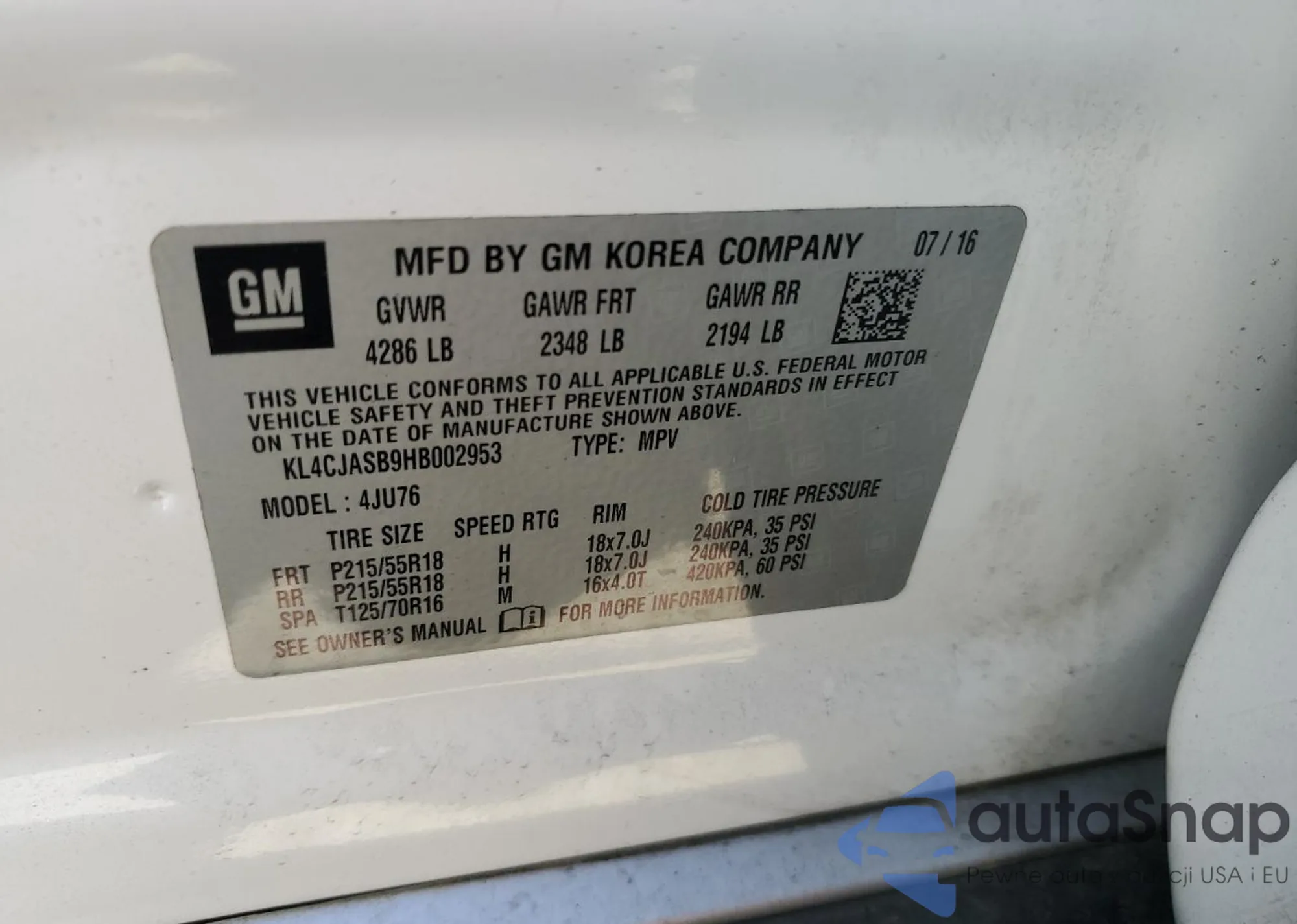 • VIN KL4CJASB9HB002953