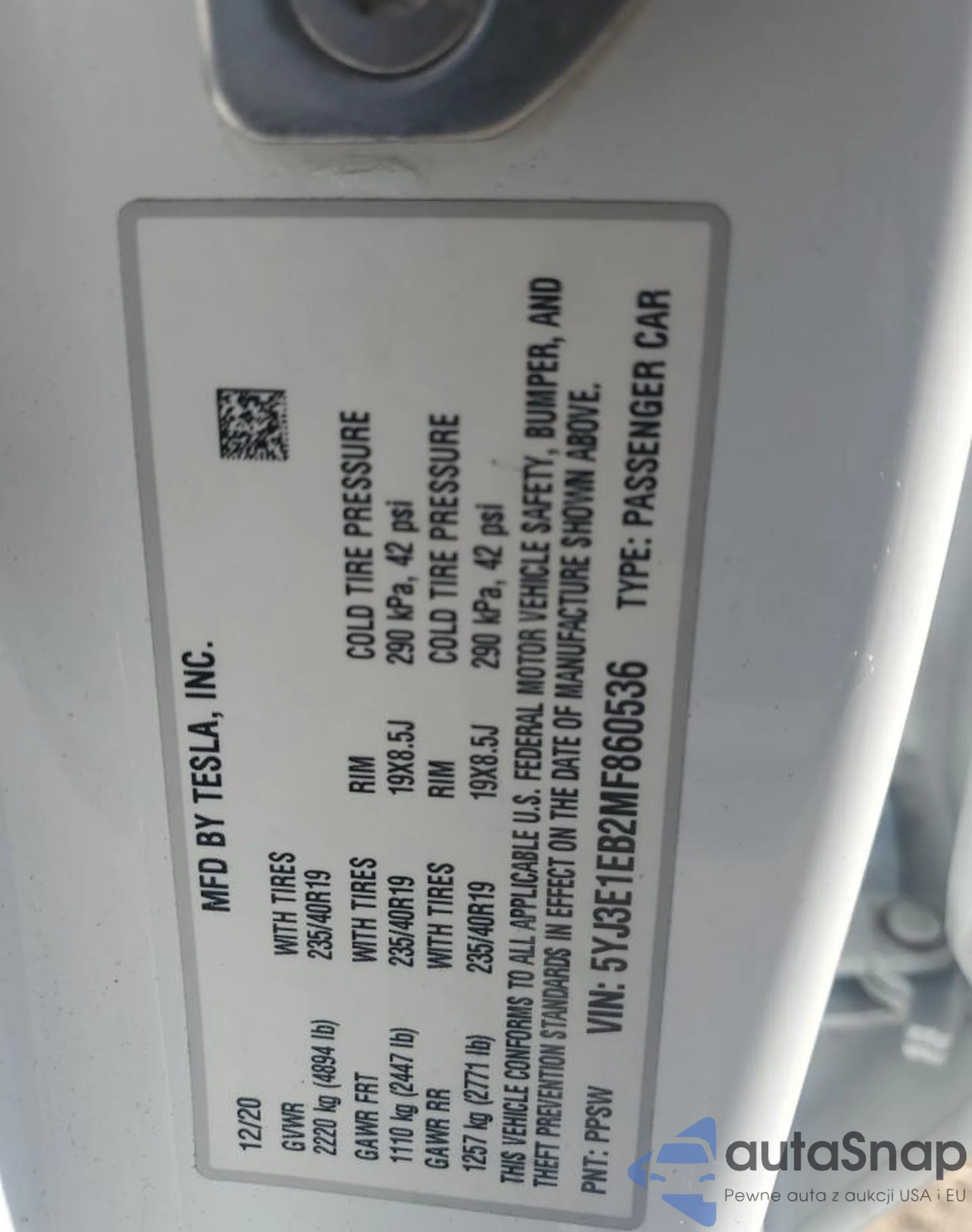 2021 Tesla Model 3 z USA, uszkodzony, nr VIN 5YJ3E1EB2MF860536