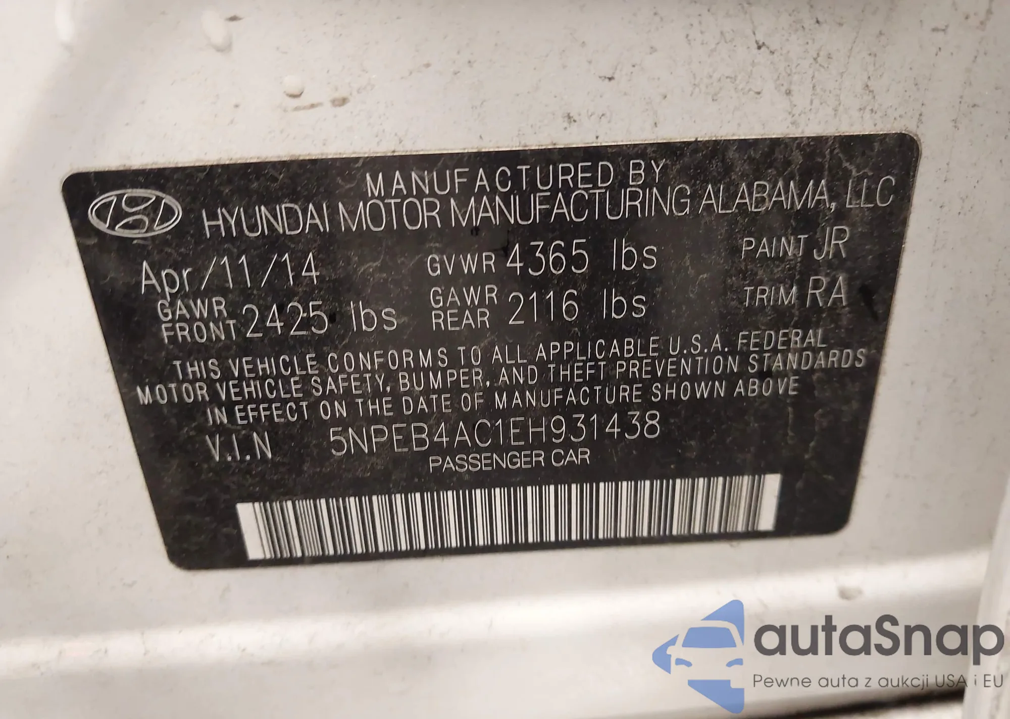 • VIN 5NPEB4AC1EH931438