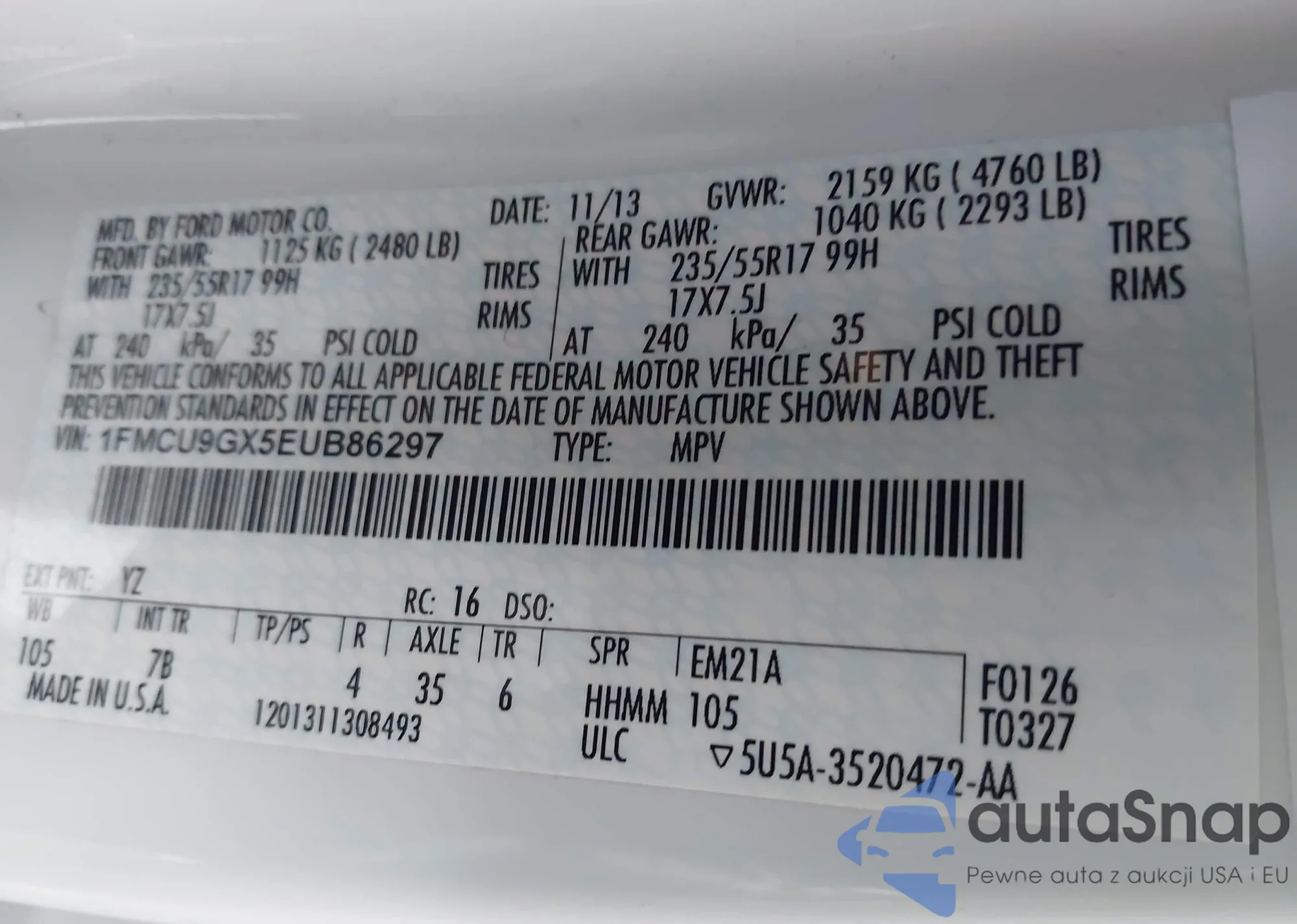 LOT: 43729141 VIN: 1FMCU9GX5EUB86297