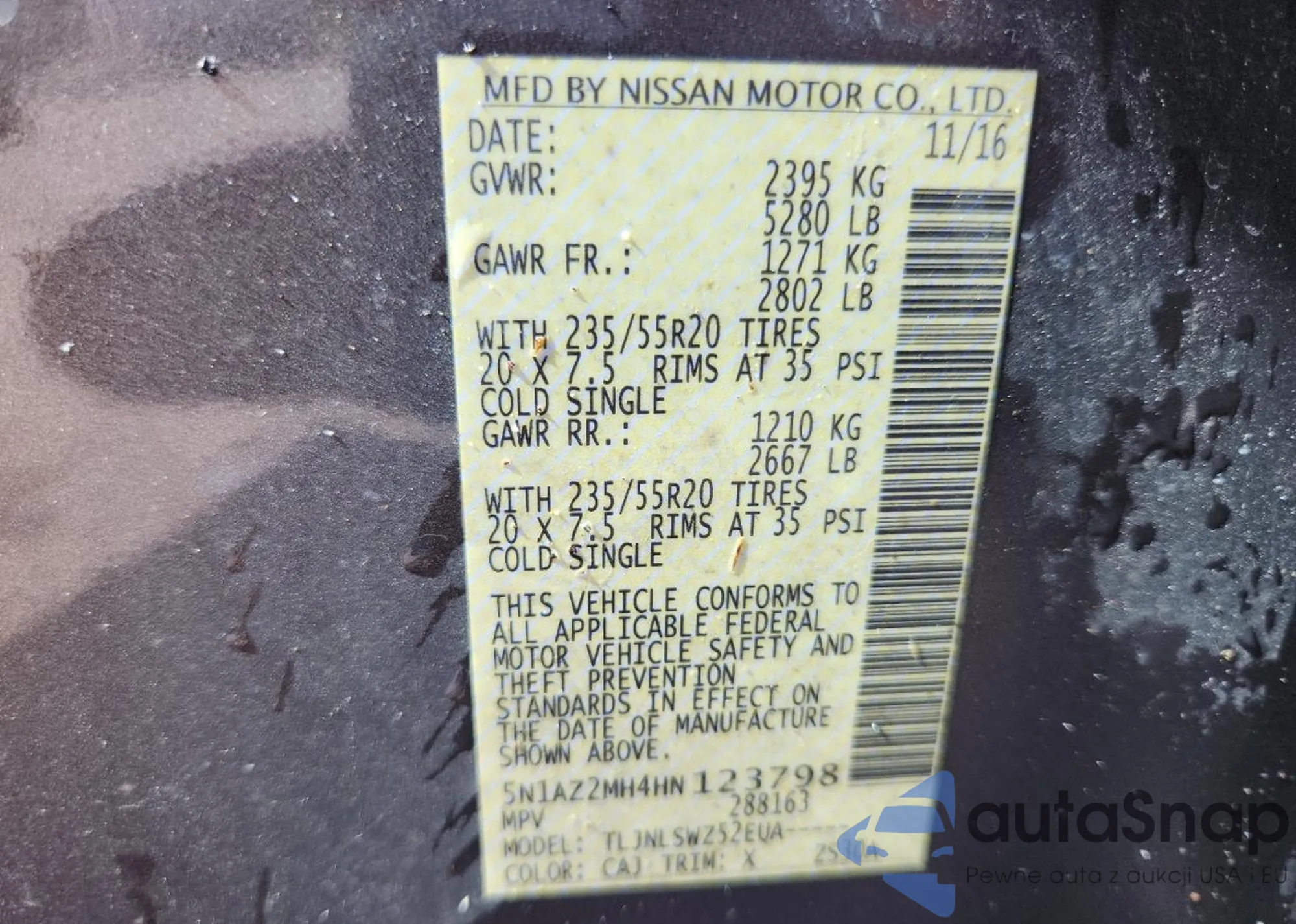 LOT: 91603415 VIN: 5N1AZ2MH4HN123798