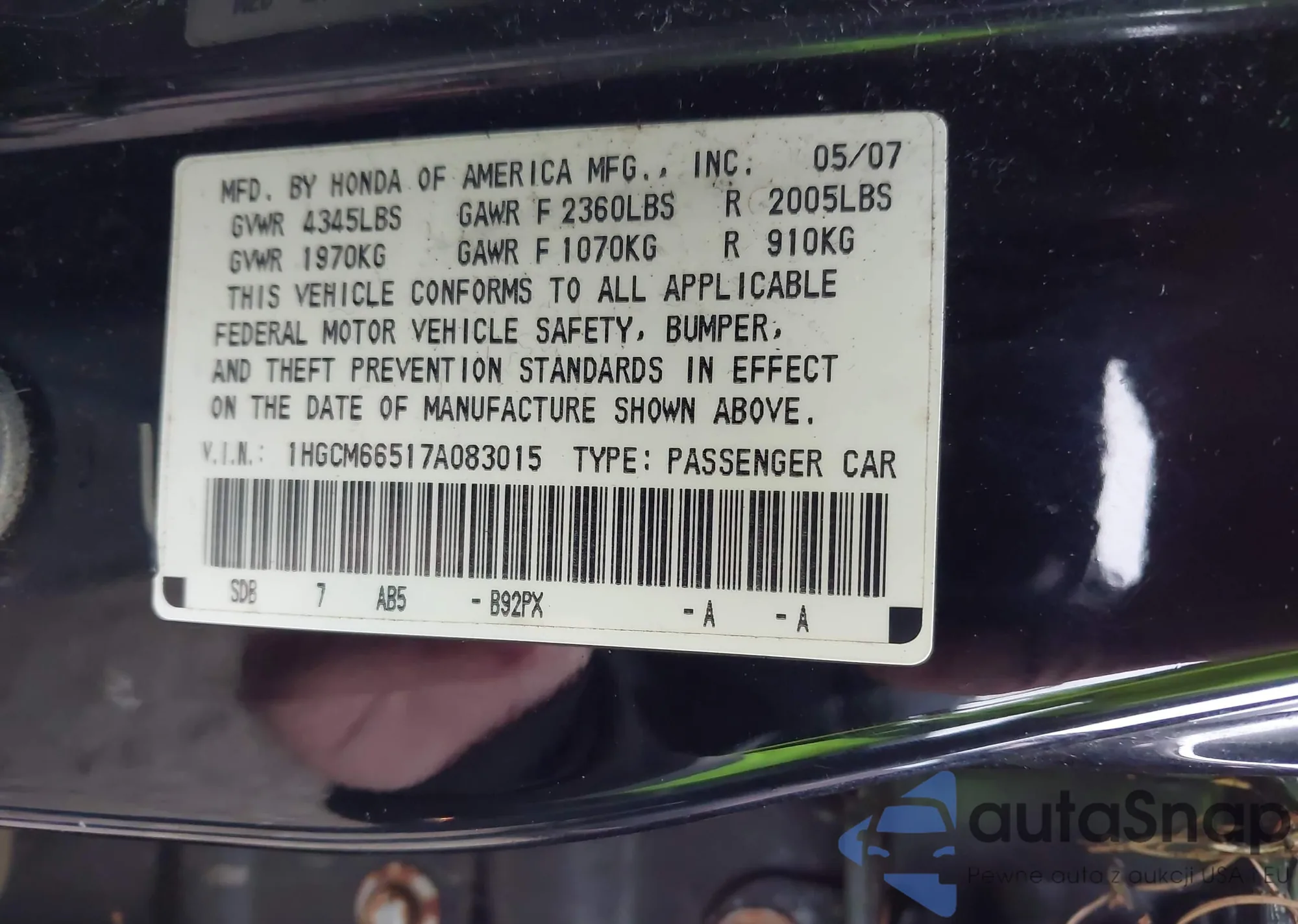 LOT: 43717442 VIN: 1HGCM66517A083015