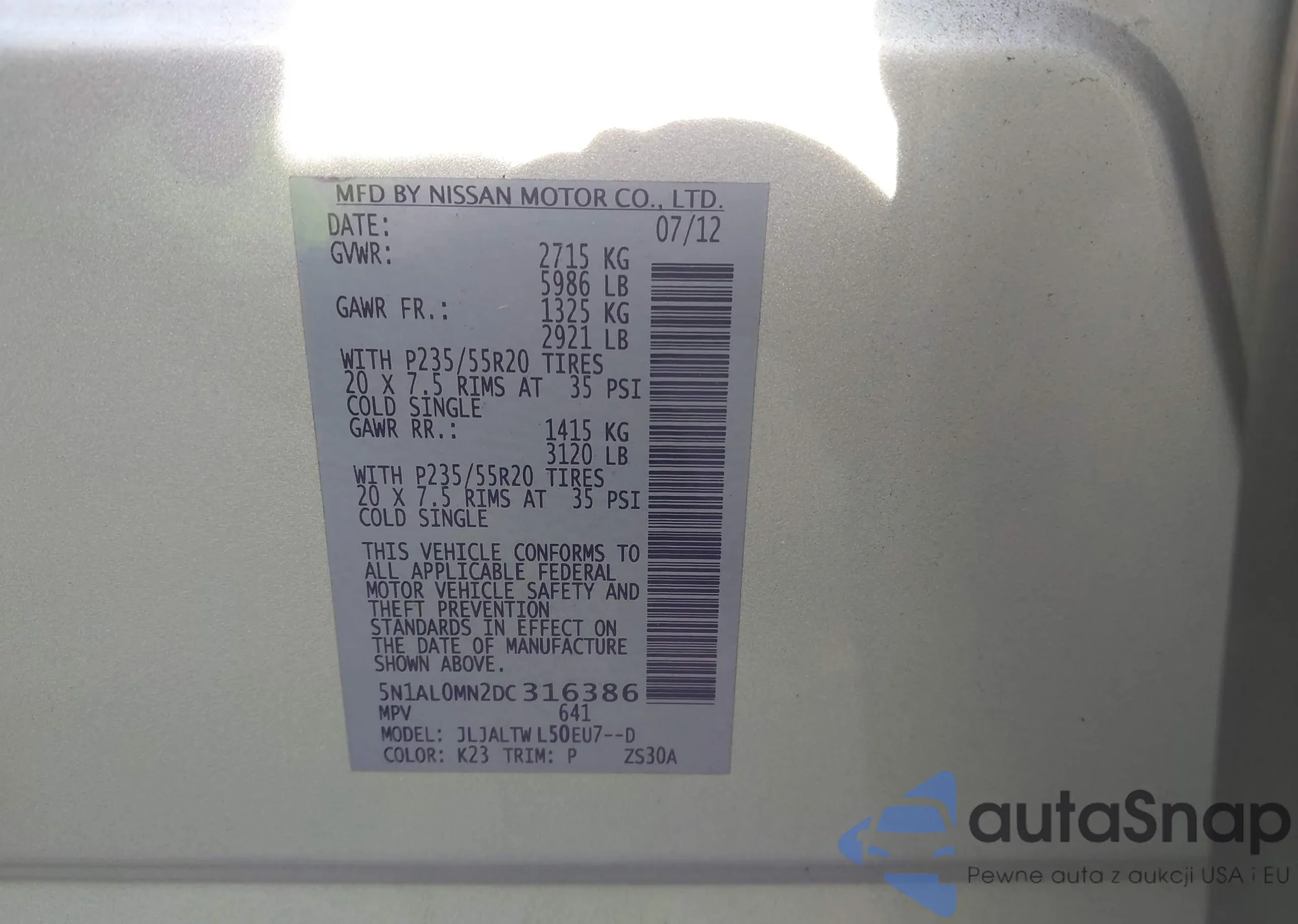 • VIN 5N1AL0MN2DC316386