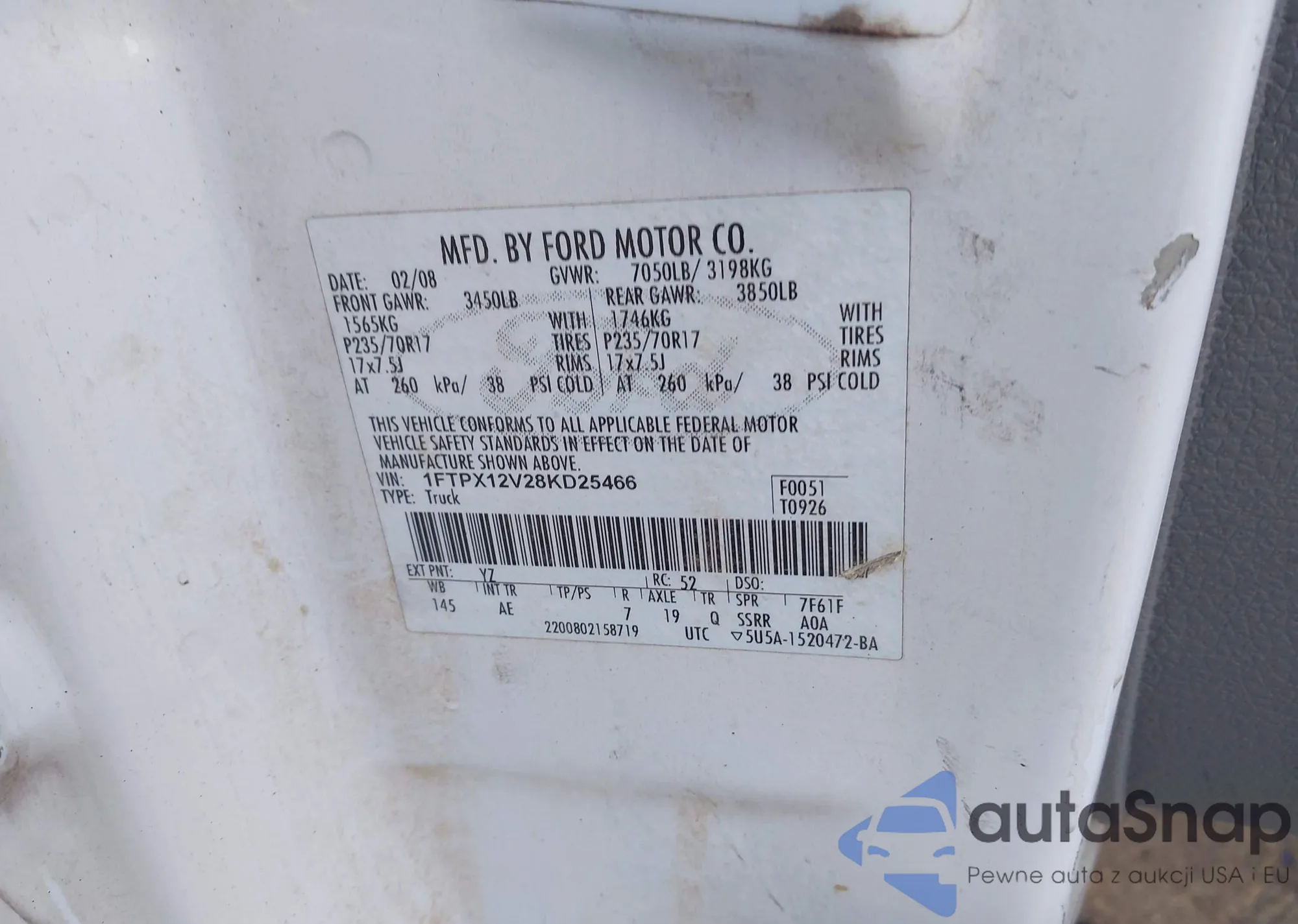 • VIN 1FTPX12V28KD25466