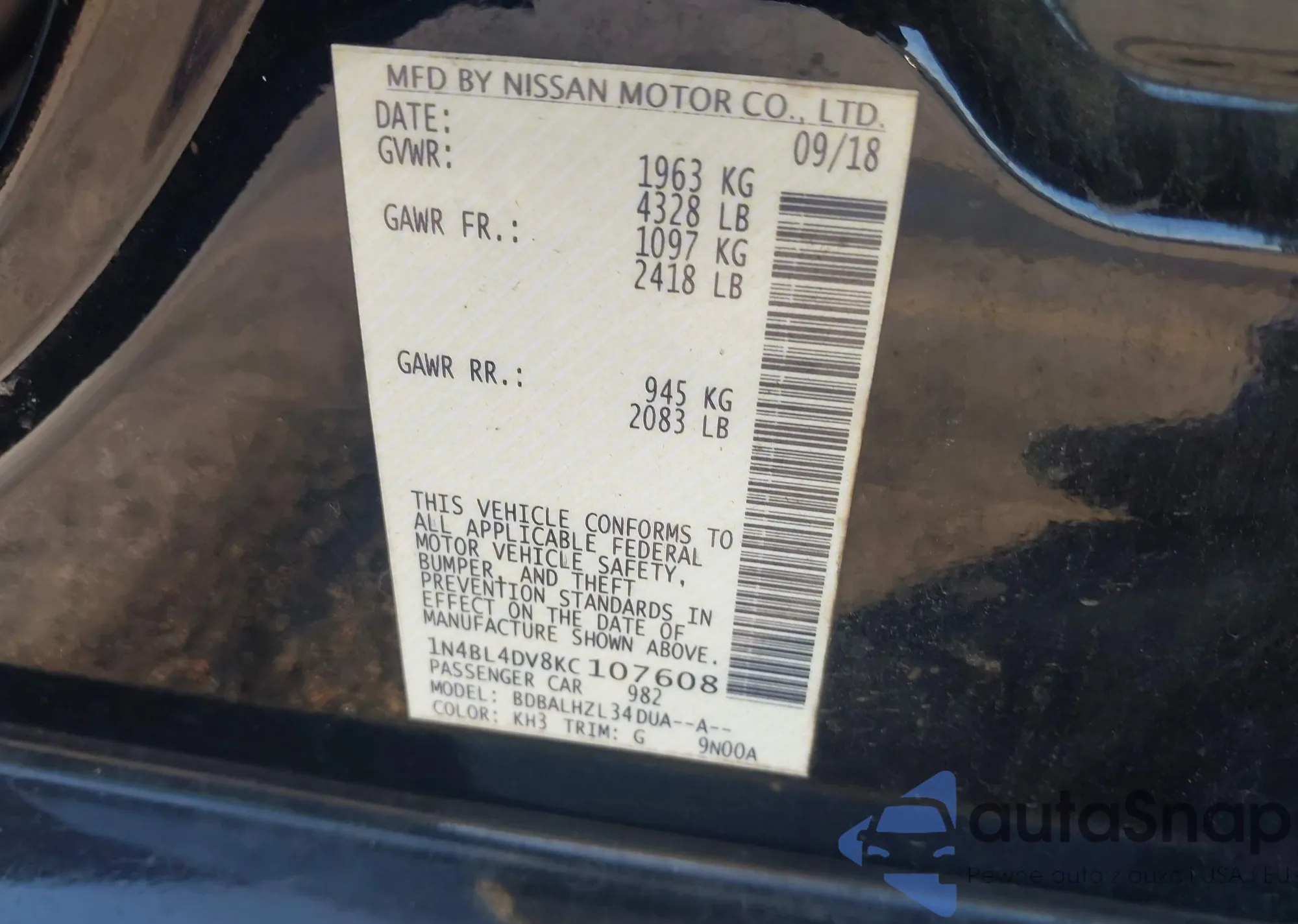 LOT: 43788601 VIN: 1N4BL4DV8KC107608