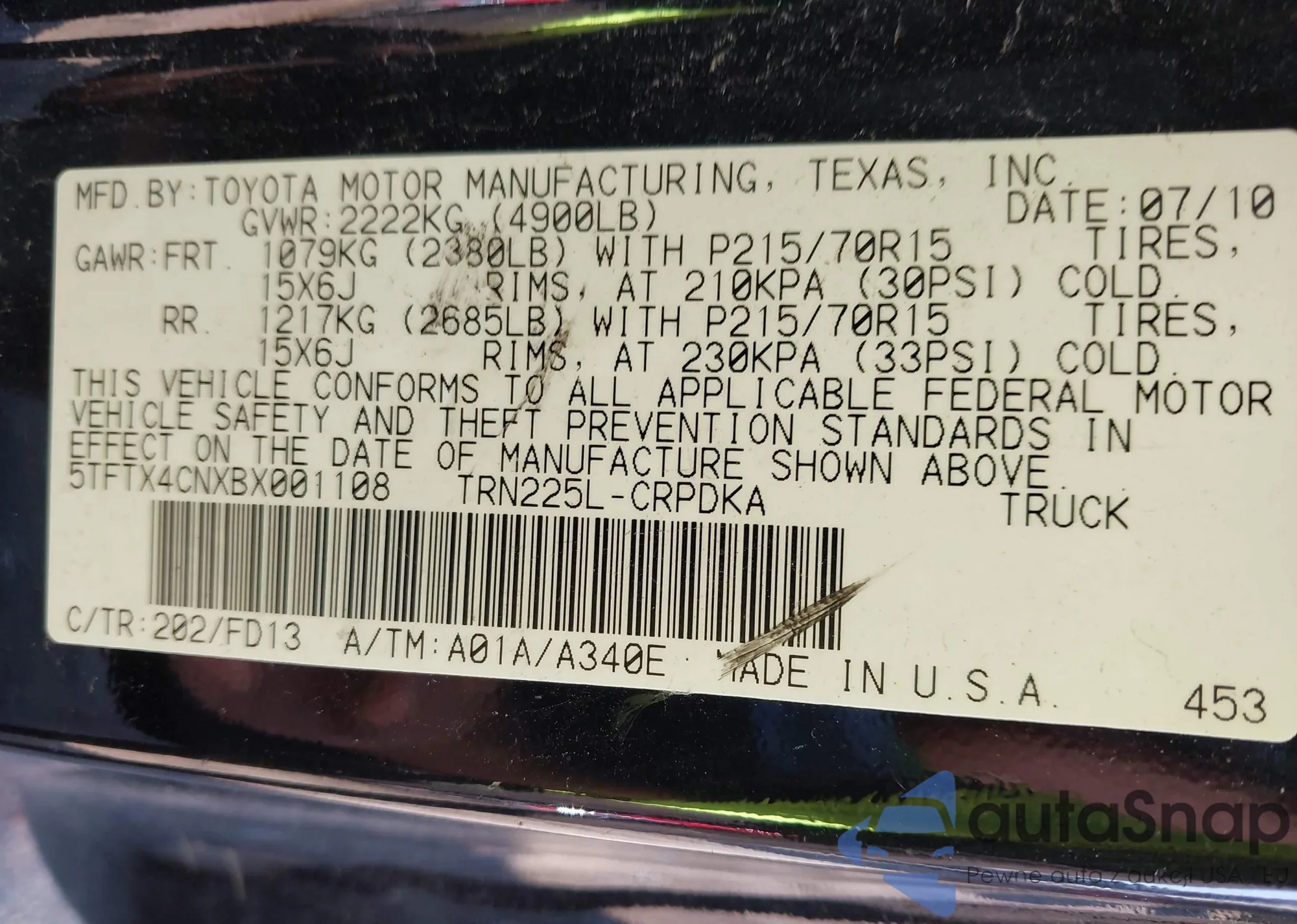 • VIN 5TFTX4CNXBX001108