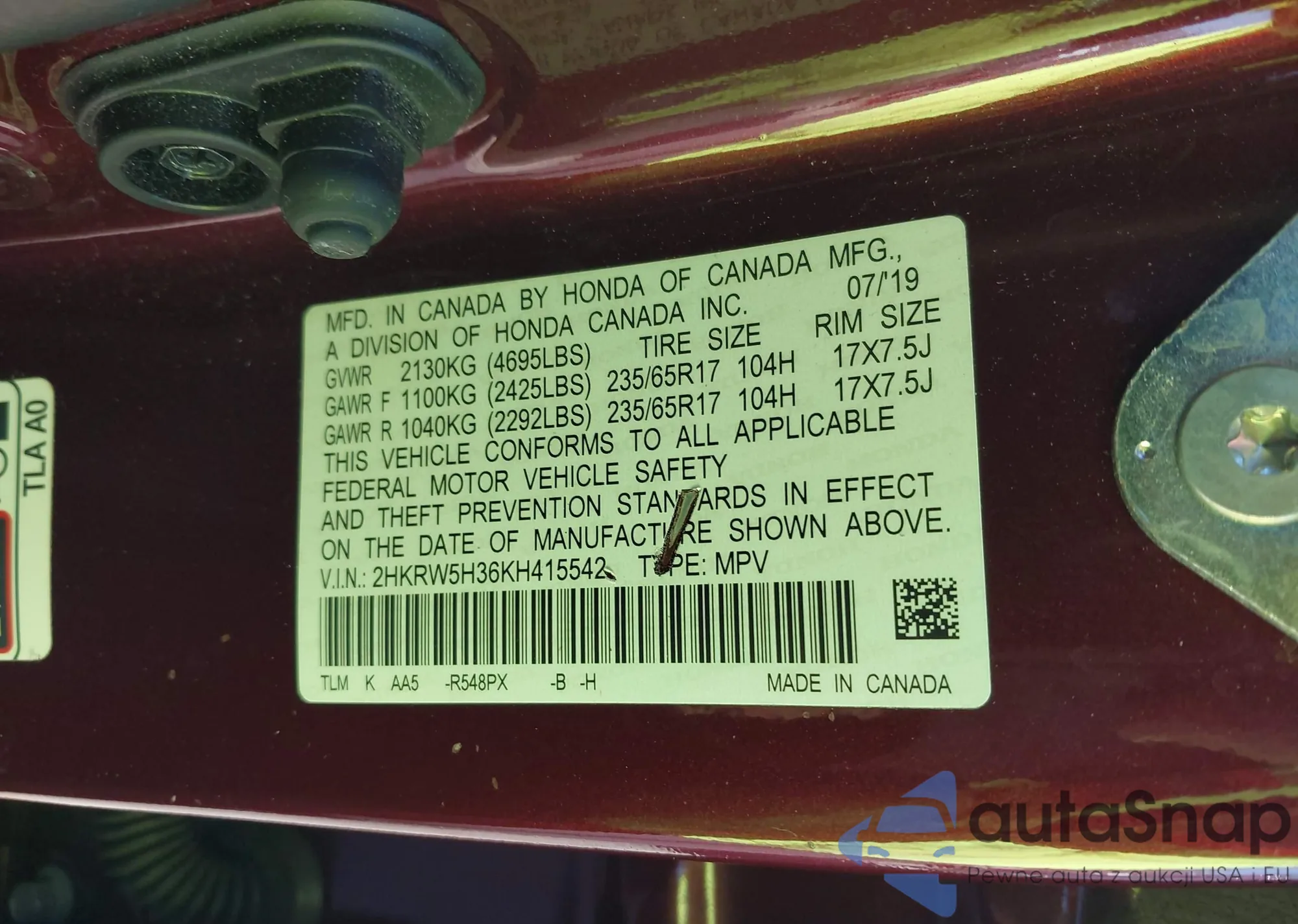 • VIN 2HKRW5H36KH415542