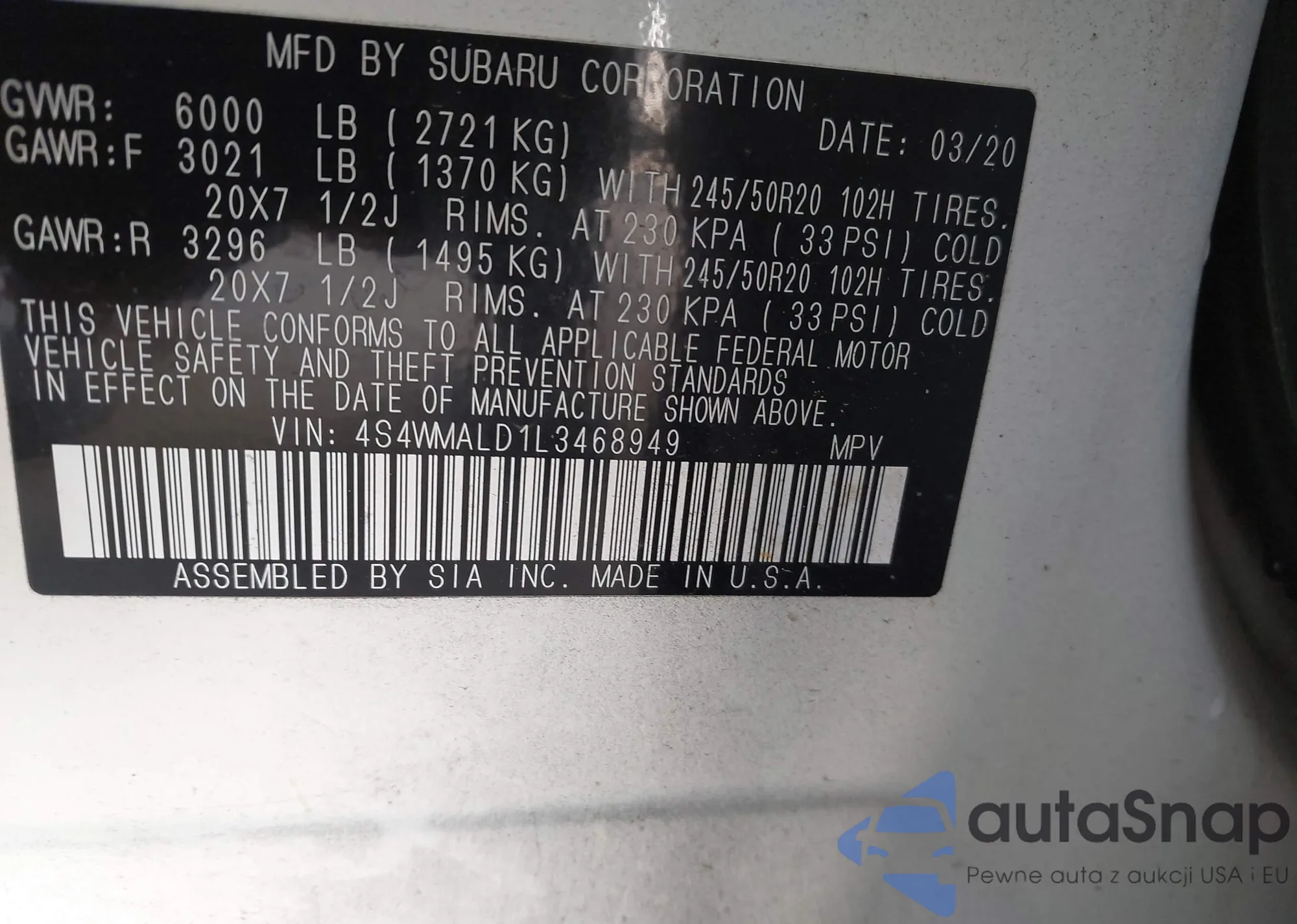 LOT: 43772240 VIN: 4S4WMALD1L3468949